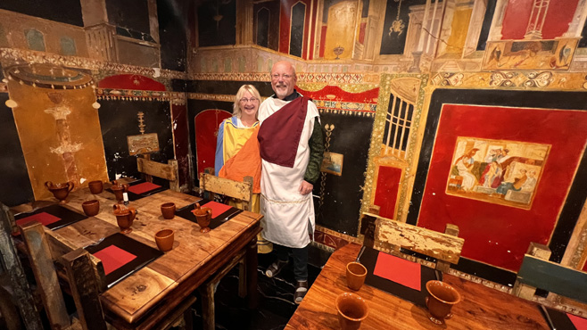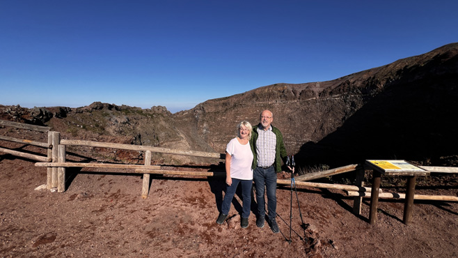 Wir haben gestern online ein Ticket für die Besteigung des Vesuvs gebucht und müssen zwischen 9 und 10 beim Gate sein. Am Parkplatz hören wir, dass die weitere Auffahrt, die mit einem Shuttlebus zurückgelegt werden muss, wegen eines Radrennens gesperrt ist. Ob vielleicht ein Shuttlebuss doch fährt, bevor die Radfahrer kommen, oder nicht und ob man auch wieder hinuntergebracht wird, keiner weiß Bescheid, keiner kennt sich aus. Es sind erstaunlich wenig Besucher da und vier kleine Busse stehen bereit. Tatsächlich fährt ein Bus. Doch leider sitzen wir wegen einer Blödsinnigkeit, die auf meine Kappe geht, in dem nicht drin. Wir setzen uns in den zweiten und warten auf weitere Fahrgäste, die aber nicht kommen. Sabine gelingt es, den Fahrer zu bewegen, mit nur uns beiden an Bord loszufahren. Vom Ende der Straße geht es nun zu Fuß hinauf zur Caldera. Eigentlich wollte ich mein lädiertes Bein schonen und Sabine alleine hinaufgehen lassen, doch dann denke ich, ich versuche es und schau mal, wie weit ich komme. Wir gehen sehr langsam und unglaubicherweise schaffe ich den Aufstieg. Der Ausblick in den Krater, aber vor allem hinunter auf Neapel und den Golf mit seinen Inseln ist echt beeindruckend. Wir feiern den Bergsieg mit einem Glas Prosecco, denn da oben gibt es ein Cafe. Der Abstieg zieht sich dann aber in die Länge, weil mein Bein schmerzt. Es kommen uns massenhaft Leute entgegen, anscheinend ist das Radrennen vorbei. Am Nachmittag möchten wir uns Pompeji ansehen. Wir stellen uns gleich auf den erstaunlich günstigen Campingplatz neben dem Eingang. Auch in Pompeji darf ich (nach kurzer Diskussion) mit dem Scooter rein, was aber eine echt schlechte Idee ist. Es standen zwar beim Eingang Rollstühle zur Verfügung, aber barrierefrei schaut völlig anders aus. Großteils liegt noch das zweitausend Jahre alte Straßenpflaster aus großen Steinen mit breiten Fugen. Völlig unmöglich, mit dem Scooter zu fahren. Die Anlage ist so riesig und so voller Leute, dass mein Bein, das sich bei einer Mittagsrast gut erholt hatte, schnell wieder stark schmerzt. Wir müssen die Besichtigung drastisch kürzen und kehren mehr (ich) oder weniger (Sabine) erschöpft zum Campingplatz zurück. Den Abend beschließen wir in einem unweit gelegenen urigen Restaurant, in dem die Kellner und viele Gäste in Togen gekleidet sind. Km 39/1415.