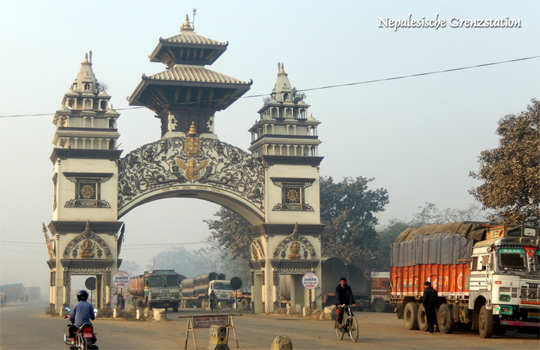 Nach kurzer Fahrt sind wir an der Grenze, die wider Erwarten gar nicht chaotisch ist. Da Nepalesen und Inder die Grenze ohne jede Formalität überqueren können, müssen nur die LKW abgefertigt werden. Und wir. Hätten wir nicht selbständig das Immigration Office und das Zollbüro aufgesucht, hätten wir ungehindert durchfahren können.