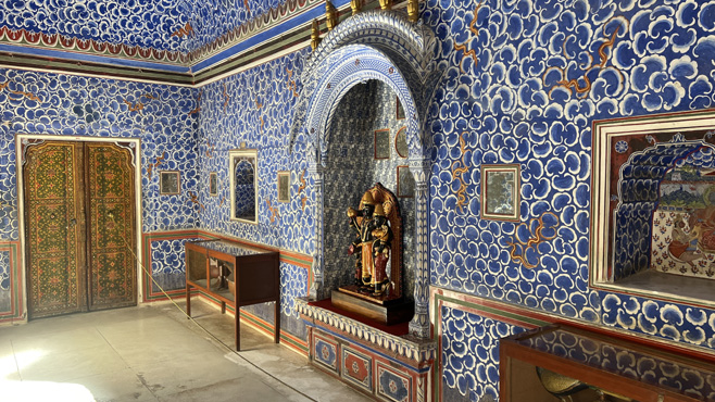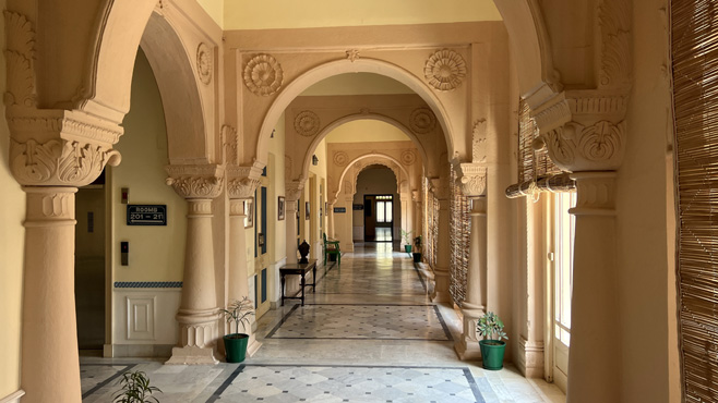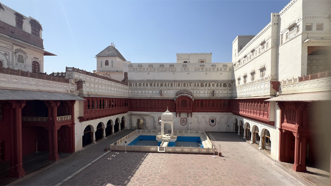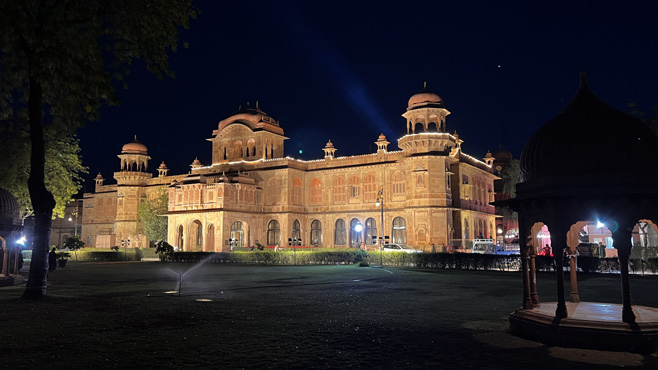 Um halb 6 wecken uns spirituelle Männergesänge aus dem Lautsprecher in einer Lautstärke, die beinahe den kurz darauf einsetzenden Gebetsruf des Muezzins übertönt. Doppelt geweckt. Unser heutiges Ziel ist Bikaner, wo wir wieder in einem alten Gemäuer Quartier beziehen: Lalargh Palace, in seinem schönen Garten und im Besitz der Familie des Maharadschas, beherbergt das märchenhafte Laxmi Niwas Hotel. Kleine Anekdote vom Beziehen des Zimmers: Die Batterie im Safe ist leer, er lässt sich nicht schließen. Kurz nach meinem Anruf an der Rezeption kommt ein Angestellter, der einen neuen Safe in den Kasten stellt, den jeder Hoteldieb bequem als Ganzes mitnehmen könnte. Ich erkläre ihm, warum das keine Lösung ist, woraufhin er verschwindet und nie wieder gesehen wurde. Die Hauptsehenswürdigkeit der Stadt ist das Fort Junagarh, eine beeindruckende Festung und zugleich alter Palast der Maharadschas aus dem 16. Jahrhundert. Die zahlreichen Räume bestechen durch ihre farbenprächtigen Wandmalereien und filigranen Schnitzereien. Ein Museum zeugt von der einst großen, auch politischen, Bedeutung Rajasthans. Wir besichtigen noch den in der Altstadt gelegenen Jain-Tempel Bhandasar und verbringen dann zwei gemütliche Stunden im Garten unseres Hotels und mit einem Mojito am Pool. Morgen findet im Palast eine pompöse Hochzeit statt, die Vorbereitungen laufen auf Hochtouren, überall wird dekoriert, werden Bühnen und Beleuchtung aufgebaut. Im Hotel nebenan, „unserem“ Hotel, wird heute schon der Junggesellenabschied gefeiert in einem Stil, der an eine Oscarverleihung erinnert: Roter Teppich, Glitzernde Kleider (wenngleich hier vielfach Saris), Smokings, Open-Air-Konzert, 200 Meter langes Buffet. Alles vom Feinsten. Fast alles, denn die Gläser werden in Schaffeln mit grauslichem Wasser kurz gespült und wandern gleich wieder zurück zur Ausschank.