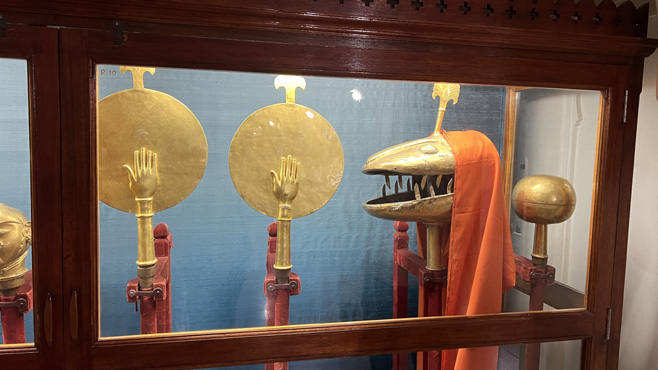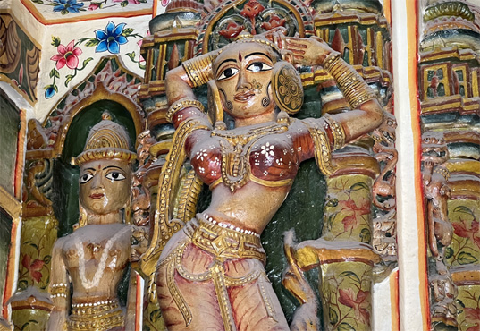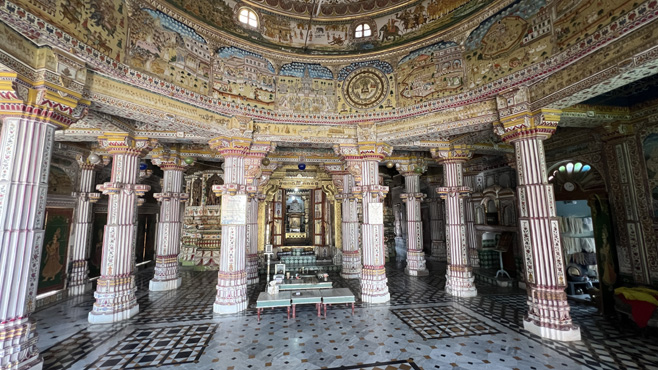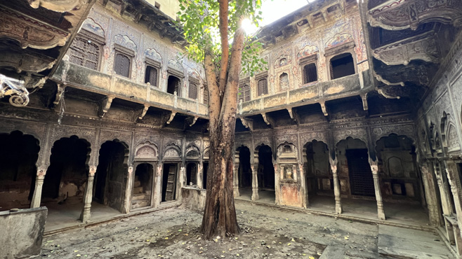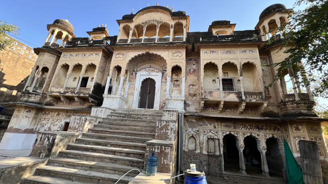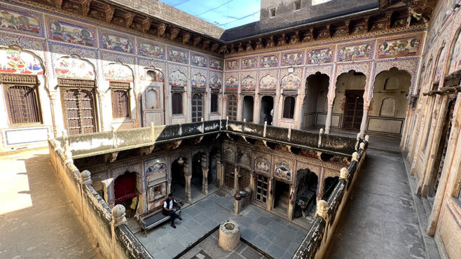 Wir fühlen uns noch ziemlich schwach, bringen zum Frühstück kaum was runter. Heute geht es nach Mandawa, wo wir im Mandawa Castle, wiederum einem stilvollen Hotel, übernachten. Gleich bei der Ankunft begrüßt uns noch auf dem Parkplatz unser Führer für die Stadtbesichtigung. Wir vereinbaren, uns in eineinhalb Stunden hier zu treffen. Unser Zimmer gereicht einem Maharadscha zur Ehre. Beim Auspacken kommt es mir aber komisch vor, dass wir in Mandawa einen Führer haben, denn wir haben nur für die größeren Städte einen gebucht. Dann ist es klar: Der Mann ist eine Fake-Guide. Der stand schon da und wusste gar nicht, wer wir sind und hat sich als unser Führer vorgestellt. Und dann wird er uns nach der Führung abzocken! Wir besichtigen in aller Ruhe das Schloss und machen uns dann ohne Führer auf zur Stadterkundung. In Mandawa gibt es viele, an die 200 Jahre alte, palastähnliche Häuser, die Hawelis genannt werden, und außen wie innen mit bunten Fresken bemalt sind. Leider sind die Sandsteingebäude vielfach in einem schlechten Zustand, in vielen aber sind die Gemälde aufgefrischt, die Alltagssituationen, Heilige, Politiker, eine Eisenbahn, aber auch die Sehenswürdigkeiten von Venedig zeigen. Wir sind schon gut zwei Stunden unterwegs, als uns der motorradberittene Fake-Guide entdeckt und sich beschwert, dass wir nicht wie vereinbart zum Treffpunkt gekommen sind. Wir erklären ihm die Sache, da greift er zum Handy und zeigt uns seinen Auftrag, auf dem unsere Namen angeführt sind. Ich sehe bei unserer Reisebuchung nach: Kein Führer in Mandawa. Er ist trotzdem ungehalten, ich sage, es ist kein Schaden entstanden, wir haben keine Führung gebucht und keine Führung erhalten, er hat keine Führung machen müssen, aber eine Führung bezahlt bekommen. Wahrscheinlich ist ihm um‘s Trinkgeld leid. Wir besichtigen gerade einen Tempel, als auf der Straße fröhliche Musik zu hören ist. Ein mit Tagetes geschmückter Leichnam wird auf einer Bahre zur Einäscherung getragen. Vor der mit bunten Luftballons geschmückten Bahre gehen die Musikanten, dahinter folgen knapp 20 Männer. Ein Trauerzug ohne Trauer. Zum Abendessen sitzen wir auf einer Dachterrasse mit Blick auf die wenig beleuchtete Stadt. Anorak Mitnehmen hat sich ausgezahlt.