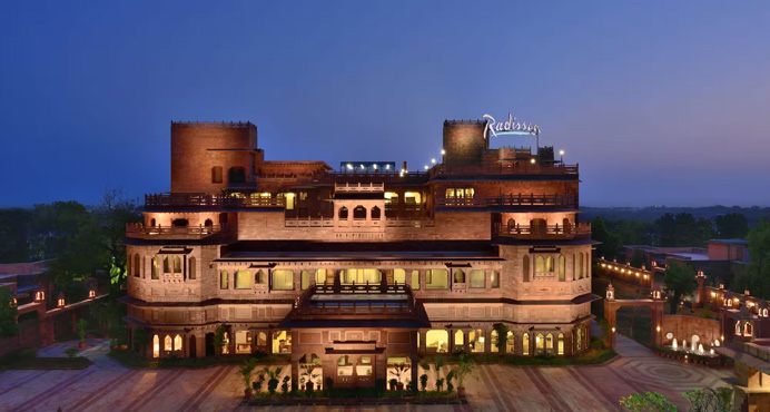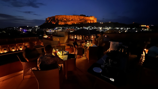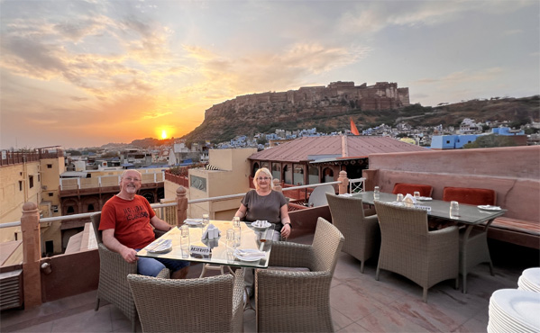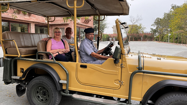 Indien hat sich seit meinem letzten Besuch vor 10 Jahren stark verändert, vor allem hier in Rajasthan: Die Straßen sind gut ausgebaut, der Verkehr ist sehr geordnet, es ist sauber, Armut ist kaum wo zu sehen. In Jodhpur ist erstmals auf unserer Reise ein Zimmer bei unserer Ankunft noch nicht fertig und wir hängen eine Stunde in der Lobby rum. Alles überragend thront die Festung Meherangarh auf einem Felsen inmitten der Großstadt. Die Besichtigung ist ein Genuss. Die Wände etlicher mehrstöckiger Höfe scheinen mit feinen Holzschnitzereien verziert zu sein, doch es ist alles Stein. Neben prunkvollen Räumen gibt es ein Museum, das unter anderem Elefantensitze (ja genau die, die mit Schirm ausgestattet, den Tieren auf den Rücken gebunden werden) und Babywippen zeigt. Von der Festung blickt man auf die Altstadt, wobei in einem Viertel viele blaue Gebäude auffallen, die Häuser der Brahmanen. Wegen dieser Häuser wird Jodhpur auch die Blaue Stadt genannt. Unweit der Festung befindet sich, oberhalb eines kleinen Sees gelegen, das Jaswant Thada, das weiße Marmordenkmal für Maharadscha Jaswant Singh. Von hier überblicken wir die ganze Stadt, aus der in ein paar Kilometern Entfernung der neue Sultanspalast Umaid-Bhawan aufragt. Da wir ja mit privatem Chauffeur unterwegs sind, ist ein spontaner Ausflug dorthin natürlich ganz einfach. Raj navigiert, wie immer, mit dem Handy zwischen den Beinen auf dem Sitz, durch die Stadt. Später halten wir noch an einem riesigen „Antiquitäten“-Laden, der vollgestopft ist mit auf alt getrimmten Deko-Gegenständen. Es sind wunderschöne Sachen, am liebsten möchte man den Laden leerkaufen, aber alles ist völlig überteuert. Im Stadtzentrum lassen wir uns von Raj in der Nähe des Uhrturms absetzen und geben ihm für heute frei. Wir sind noch nicht weit gegangen, schallt eine bekannte Stimme über den Platz: „Hallo Herr Doktor!“ Unglaublich: Unser Reiseführer aus Delhi läuft hier mit Touris herum, kommt auf mich zugestürmt und umarmt mich wie einen Bruder. Es scheint, als wäre er mit dem Trinkgeld zufrieden gewesen. Wir lassen uns durch die Gassen treiben, kaufen auf dem Basar ein paar Gewürze und sitzen dann zum Sonnenuntergang in einem Dachrestaurant mit Blick auf die Festung. Die Lammrippchen Tandoori schmecken vorzüglich, doch sie sind nur zu dritt, sowas von winzig und außerdem nur von ein paar Zwiebelringen begleitet, dass es an einen Skandal grenzt. Schöner Zufall, dass Sabine fast eine halbe Pizza übrig lässt.