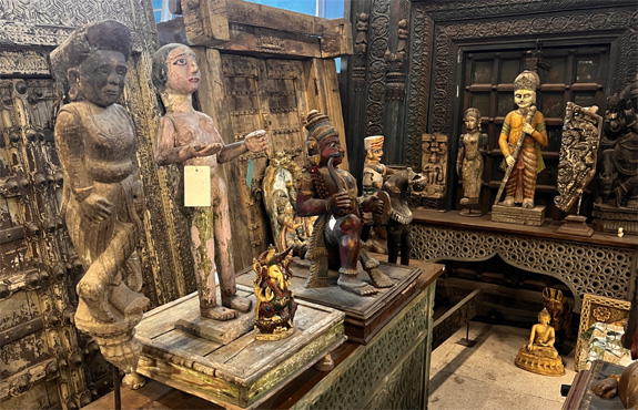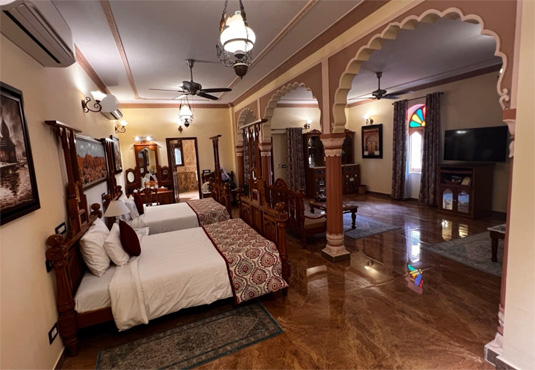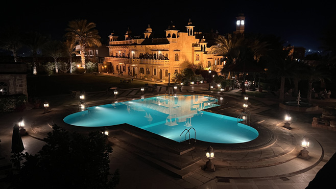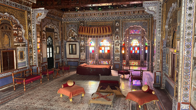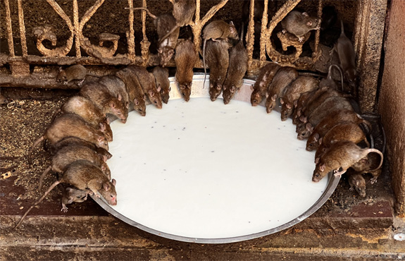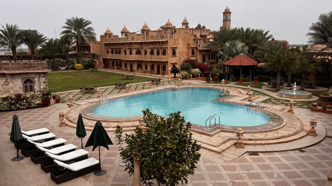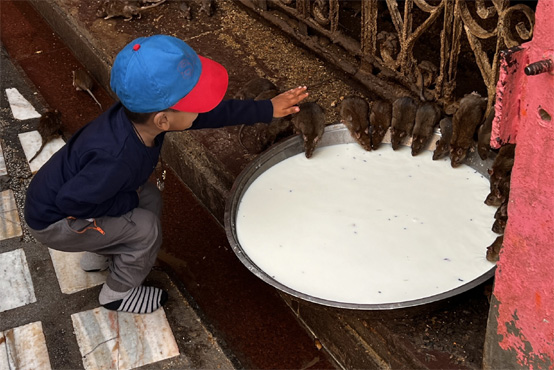 Etwa 30 Kilometer südlich von Bikaner liegt der Karni-Mata-Tempel, eine Sehenswürdigkeit der schrägen Art, denn hier leben – die Angaben gehen weit auseinander – zwischen 5.000 und 20.000 heilige Ratten. Wie in jedem hinduistischen Tempel müssen Besucher die Schuhe ausziehen.aber Touristen dürfen Socken anbehalten. Die Böden im Tempel sind feucht bis nass, der Grund dafür ist hoffentlich, dass öfter mal aufgewischt wird. Die Ratten huschen durch den ganzen Tempel, versammeln sich aber an den Altären, wo ihnen von Besuchern Futter dargebracht wird. Am Rand von Schüsseln mit Milch posieren sie für Fotos und manche lassen sich streicheln. Sie zu berühren oder gar ein weißes Exemplar zu erspähen soll Glück bringen. Gut vorbereitete Besucher wie wir entsorgen nach dem Tempelbesuch ihre Socken, haben Feuchttücher dabei und frische Socken griffbereit. Noch vor Mittag beziehen wir unsere nächste Unterkunft im Fort der kleinen Stadt Khimsar. Es sind kaum andere Gäste da. Wir sehen uns eine Sammlung von lackglänzenden Oldtimern an, spazieren über die Fortmauer und durch die Gärten und haben den Pool ganz für uns allein. Am späten Nachmittag machen wir eine Safari im offenen Geländewagen durch die Wüste, die nicht wirklich eine ist, denn sie ist von niedrigen Stauden und Bäumen bewachsen. Es gibt eine Menge Antilopen und Springböcke zu sehen, auch ein Dromedar läuft uns über den Weg. Dazwischen weiden vereinzelt Kühe, ein seltsames Bild für eine Wüste. An einer Stelle haben sie auf einer Fläche von einem halben Quadratkilometer zwei Sanddünen von jeglichem Bewuchs befreit. Auf der Spitze der einen Düne gibt es eine Bar, vor der man mit Kaffee oder Tee und Snacks auf bequemen Stühlen sitzt und auf einen kleinen See zwischen den Dünen blickt, um den sich Hütten eines kleinen Camps gruppieren. Unsere Bäuche sind mittlerweile wieder soweit hergestellt, dass wir uns trauen, das fantastische Abendbuffet in unserem Hotel durchzukosten. die Geschmacksvielfalt der indischen Küche ist unglaublich!