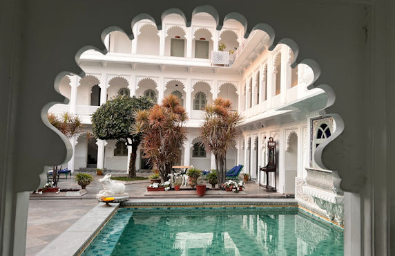 Die Bishnoi sind eine Sekte, die sich schon seit Jahrhunderten dem Schutz der Natur widmet. Sie leben nach 29 großteils vernünftig klingenden Geboten, essen kein Fleisch, fällen keine lebenden Bäume und konsumieren zur Nahrungsergänzung Opium. Wir besuchen eine Bishnoi-Familie, sehen beim Fladenbrot Backen, Töpfern und bei der Opium-Extraktion zu. Sabine kostet das Extrakt natürlich und ist ein wenig schräg drauf die nächsten zwei Stunden. In einer kleinen Stadt essen wir recht gut zu Mittag. Viele Restaurants haben zwar eine große Speisekarte, doch die darin aufgeführten Fleischgerichte gibt es gar nicht. Die Auswahl an vegetarischen Gerichten ist aber groß, allerdings weiß man oft nicht, was genau man bestellt. Auf der anderen Straßenseite entdecken wir einen kleinen Supermarkt, das kommt sehr gelegen. Der Besitzer ist so erfreut über unseren Besuch, dass er den Einkaufskorb für uns trägt und uns dann an der Kassa Stühle anbietet, damit wir es bequem haben, während er die Rechnung macht. In Ranakpur besichtigen wir den fantastischen Jain-Tempel aus weißem Marmor. Über tausend Säulen, von denen keine zwei gleich sind, tragen eine Vielzahl von Kuppeln, alles ist mit detaillierten Ornamenten verziert. Welch berührender Ort! Kurz vor Sonnenuntergang erreichen wir Udaipur und wir beziehen für zwei Nächte ein Zimmer im wunderschönen Hotel Amet Haveli, direkt am Pichola-See.
