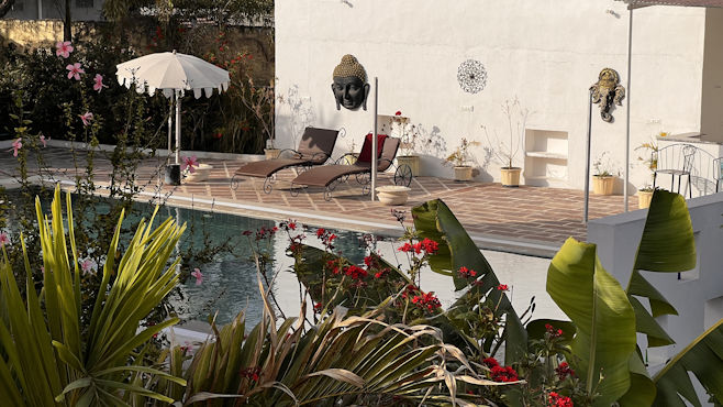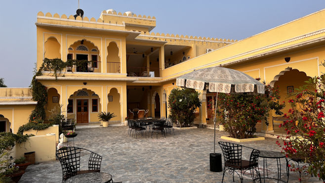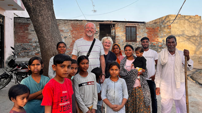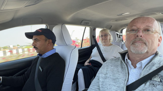 Mit Raj haben wir echtes Glück, denn er ist ein guter und sicherer Fahrer und ist stets freundlich und zuvorkommend. Er verdient unseren größten Respekt. Unterwegs nach Chhabariya gibts öfter wieder keinen Handyempfang und Raj ist unsicher, wenn er an Kreuzungen kommt. Obwohl wir ja gar kein mobiles Internet haben, kann ich ihm leicht helfen mit der Navigation, da ich die Offline-Karten von Indien runtergeladen habe. Raj versteht nicht, warum ich navigieren kann und er nicht und schaut mich jedesmal ehrfürchtig an wie einen Guru. Als wir kurz vor zwölf eine Stadt durchfahren, sage ich Raj, dass wir in der nächsten halben Stunde zu Mittag essen möchten und er an einem Restaurant halten soll. Er fährt aber noch aus der Stadt raus und als wir in die nächste Stadt kommen, ist eine Dreiviertelstunde vergangen und mir knurrt der Magen. Er schaut zwar immer nach links und rechts, hält aber nicht an. Nun ist auch hier das Ende der Stadt erreicht und ich frage ihn, ob er denn unseren Wunsch vergessen hat. Hat er nicht, er hat aber nichts gesehen, was unseren vermeintlichen Ansprüchen gerecht wird. Ich sage, er soll umkehren, da wurde doch mehrfach an der Straße gekocht. Er fragt an einer Tankstelle nach einem Restaurant und meint dann, in nur 15 Kilometern gäbe es etwas Nettes. 15 Kilometer sind aber eine halbe Stunde. Ich bleibe dabei, er muss zurückfahren. Gleich beim ersten Imbiss lasse ich ihn halten und siehe da: Eine halbe Stunde später sind wir gestärkt und wieder bester Laune. Es gibt frisch zubereitete, scharfe, heiße Suppe und Tiefkühlpizza. Die Küche hat nur eine Steckdose. Während der Pizzaofen in Betrieb ist, muss der Gefrierschrank pausieren. Unser heutiges Ziel ist das 600-Einwohner-Dorf Chhabariya, das außer einem kleinen Heritage-Hotel mit 12 Zimmern nur aus ärmlichen Häusern, ein paar Tempeln, Staub und Kuhkacke zu bestehen scheint. Im Hotel werden wir wie die Maharadschas mit Trommel begrüßt, die Hausherrin malt uns rote Punkte auf die Stirn, bewirft uns mit Blütenblättern und knüpft uns Bänder an die Handgelenke. All das erscheint uns aufrichtig und authentisch und erinnert kein bisschen an den Zirkus, den sie oft wo für Touristen veranstalten. Wir sind die einzigen Gäste des Hotels, das mit Ausnahme eines Kühlschranks im Zimmer alle Annehmlichkeiten bietet. Der Besitzer macht mit uns einen Spaziergang durch das Dorf und versteht es vorzüglich, aus dem Nichts des Dorfes eine unterhaltsame Tour zu machen. Alle Leute im Dorf grüßen herzlich und im Nu werden wir von einer Schar Kinder begleitet. Die Kids sind unaufdringlich und sauber, die eine oder andere Nisse leuchtet aus dunklen Haaren. An einem winzigen Laden kaufen wir ein Sackerl Zuckerl, die wir verteilen. Die Kinder stellen sich in einer Reihe an und rufen dann im Chor „Thank you Sabine! Thank you Vienna!“ Unsere Gefühle bei der Sache sind zwiespältig. Sabine ist ein Glückspilz, denn in Kuhkacke zu treten, soll hier Glück bringen. Zum Sonnenuntergang nehmen wir einen High Tea auf der Dachterrasse des Hotels ein. Ein neuerliches Getrommle lässt an neue Hotelgäste denken, doch es kommt vom Tempel gegenüber. Und nicht ein Trommler schlägt Pauke und Glocken, sondern eine elektrische Trommelmaschine. Ein Priester und ein paar Gläubige haben sich versammelt, Kinder läuten Glocken und schlagen mit Holzschlägern auf metallene Klangkörper. Der Hausherr bespricht mit uns, was wir zum Abendessen wünschen und lädt uns zum Mitkochen in die extrem saubere Küche ein. Wir kriegen Schürzen und dürfen Chiabati machen, alles andere ist eh schon fertig. Wir dinieren sehr stimmungsvoll bei Kerzenlicht im Freien. Die Nacht ist nicht so ruhig, weil draußen immer wieder Hunde bellen, außerdem nistet ein Meisenpaar in einer Lampe im Zimmer und hinter Bildern und Spiegeln hört man Eidechsen huschen.