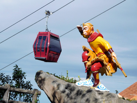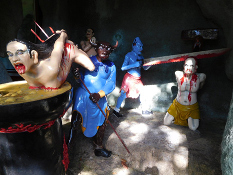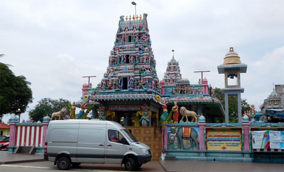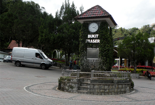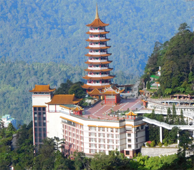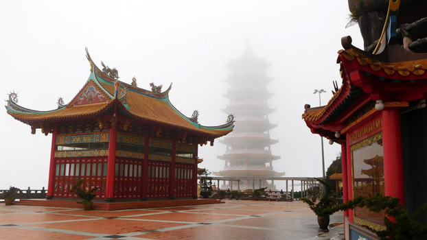 Die Nacht ist ein wenig unruhig, weil neben uns ein Auto parkt, dessen Insassen auf dem Parkplatz auf und ab gehend ein Streitgespräch führen. Damit es im Auto nicht warm wird, lassen die Leute natürlich den Motor am Stand laufen, wobei sich ständig der Kühlerventilator einschaltet, der zusätzlichen Krach macht. Das Ganze dauert über eine Stunde. In der Früh dann also wieder zu Mercedes, die Glühkerze wechseln lassen. Das sollte in einer guten Stunde erledigt sein. Ist es aber leider nicht. Zunächst fehlt ein Werkzeug zum Ausschrauben der defekten Glühkerze. Zufällig findet der Mechaniker etwas passendes in meinem Werkzeugkoffer, denn ich baue in der Zwischenzeit die beiden Bordbatterien aus, die total trocken sind und aufgefüllt werden müssen. Am Abend sollte es kaltes Bier geben! Die Glühkerze lässt sich nun zwar herausschrauben, aber dann nicht entfernen. Die mittlerweile drei Mechaniker probieren allerlei aus, doch das Ding sitzt fest. Sie wollen nun den Zylinderkopf öffnen, was ich strikt ablehne. Da fahren wir lieber mit einer kaputten Glühkerze weiter. Außerdem ist es ohnehin schon Mittag! Dann dauert es noch eine gefühlte Ewigkeit, bis Glühkontroll- und Motorkontrollleuchte zum Verschwinden gebracht werden. Von den leider umsonst geleisteten vier Mechanikerstunden muss ich eine bezahlen, macht 40 Euro. Nun noch zum Reifenhändler, wo der bestellte Reifen auf uns wartet. Auch hier geht nicht alles glatt, denn der Monteur kaputtiert eine Schraube, mit der das eine unserer Reserveräder unter der Bodenplatte befestigt ist. Die provisorische Befestigung mit zwei Kabelbindern müssen wir im Auge behalten, denn das Reserverad während der Fahrt zu verlieren wäre eine Katastrophe. Während wir aus der Stadt hinaus fahren, überschlagen wir unsere Ausgaben der letzten beiden Tage und stellen fest: Das Geld schmilzt dahin wie Eis in Singapur. Über eine kurvenreiche Straße geht es hinauf in die Genting Highways, wo auf 1.800 Metern eine Casino-Stadt entstanden ist. Hier befindet sich auch das viertgrößte Hotel der Welt mit über 6.000 Zimmern. Leider gibt es rein gar nichts zu sehen, weil die Wolken auf 1.200 Meter runterhängen. Wir sehen uns den unterhalb der Stadt in einen Steilhang gebauten chinesischen Tempel Chin Swee an, in dem um Gewinn beim Glücksspiel gebetet wird. Vom Erdgeschoß, in dem sich nur eine kleine Tempelhalle befindet, fahren wir mit einem Aufzug in den 13. Stock. In den Stockwerken dazwischen befindet sich ein Hotel. Ganz oben stehen weitere Tempelanlagen, darunter eine Pagode, ein Riesenbuddha und die Höhlen der Hölle. Auch diese lassen sich bei dem starken Nebel nur sehr eingeschränkt besichtigen. Wir finden einen ruhigen Nachtplatz auf einem völlig leeren Busparkplatz (Hochbetrieb ist hier nur an Wochenenden) und hoffen auf klare Sicht morgen Früh. Von 36 Grad in KL hat es übrigens auf 21 hier abgekühlt. Km 107/205/53.975.