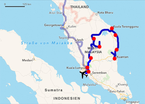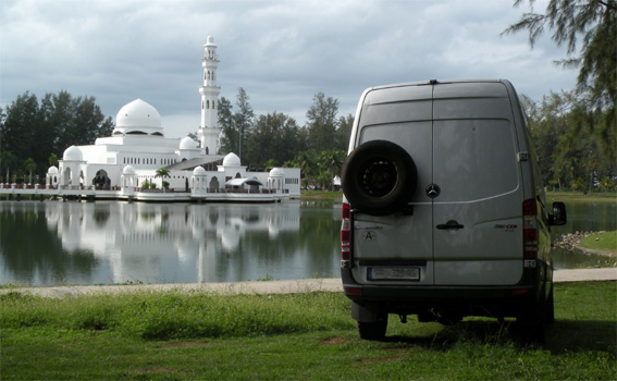 Als wir in der Früh das Gelände verlassen, halte ich am Gate und frage im Office, ob wir für die Übernachtung etwas zu bezahlen hätten. Der nette Herr verlangt einen Ringgit Parkeintritt und einen Ringgit für die Übernachtung, jeweils p. P., macht also 4 Ringgit (1 Euro). Als er aber die Eintrittskarte vom gestrigen Eintritt in den Nationalpark aus meiner Brusttasche ragen sieht, erlässt er uns sogar diesen niedrigen Betrag, wir haben ja schon am Süd-Gate bezahlt. Wo wir herkommen, fragt er. Aha, Austria. Vienna. Ob wir nicht vielleicht einen Schilling mithätten als Souvenir? Ab Gua Musang wählen wir die Straße, die zunächst durch schier endlose Palmplantagen, später durch Urwald und schließlich am Nordufer des Tasik Kenyir-Stausees entlang führt. Hier halten wir an einem schattigen Picknickplatz am Seeufer zur Mittagsrast. Bei der Gelegenheit mache ich mir nochmals Gedanken über das Zerberus'sche Turboproblem, denn der Turbo ist neuerlich ausgefallen und die Motorkontrollleuchte brennt. Recht viel fällt mir nicht ein. Der Luftfilter kann's nicht sein, den haben wir vor kurzem erneuert. Könnten irgendwelche Tiere durch den Schnorchel gekrochen sein, vielleicht darin ein Nest gebaut haben? Ich öffne den Luftfilterkasten, da ist alles sauber und wie neu, auch der Schnorchel ist ok. Ich besprühe noch die Kontakte an der Steckverbindung des Drucksensors mit Kontaktspray und siehe da, Turbo geht wieder, Motorkontrollleuchte wieder weg. Für wie lange wohl? Ich räume auch noch gleich den Kofferraum aus, um zu den Bordbatterien zu gelangen, deren Größe abgemessen werden muss, damit wir bald neue kaufen können. Am späten Nachmittag erreichen wir Kuala Terengganu an der Ostküste. Gerade als wir zu einem Stadtbummel aussteigen, fängt es an zu regnen. Schütten eigentlich. Obwohl mit Schirm unterwegs, sind wir bald klatschnass und kehren zurück zum Auto. Immerhin haben wir die Weiße Moschee, in der wir uns untergestellt haben, und die Istana Maziah, den Sultanspalast gleich daneben, gesehen. Eine kurze Stadtrundfahrt bringt uns in die Chinatown. Da es gerade zu regnen aufhört, wagen wir einen Spaziergang, gehen von der Waterfront durch eine enge Gasse namens Turtle Alley, deren Boden und Wände mit Schildkröten-Mosaiken verziert sind. Als es dämmert, fahren wir auf die große Flussinsel, von der man einen schönen Blick auf die Kristallmoschee hat. Leider sind die Gassen der Insel zu schmal für den Zerberus und zu Fuß wollen wir hier nicht gehen, die Gegend sieht in der hereinbrechenden Dunkelheit nicht sehr Vertrauen erweckend aus. Also fahren wir direkt zur Kristallmoschee, die aus Glas und Stahl erbaut wurde und in der Nacht farbig beleuchtet sein sollte. Ist sie aber nicht. Und in dem Schummerlicht sieht sie sehr unspektakulär aus. Da der Parkplatz schon fast leer ist, übernachten wir gleich hier. Leider werden wir kurz vor Mitternacht vom Parkplatzwächter geweckt. Die ganze Anlage wird geschlossen, wir müssen weg. Selber schuld. Anfängerfehler. Wir fahren nochmals in die Chinatown und parken auf einem ruhigen Platz, den wir am Nachmittag schon ausgekundschaftet hatten. Immer gut, ein paar Plätze auf Reserve zu haben. Km 268/1.023/54.793.