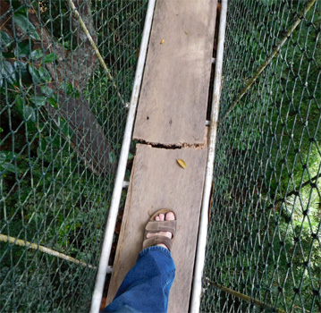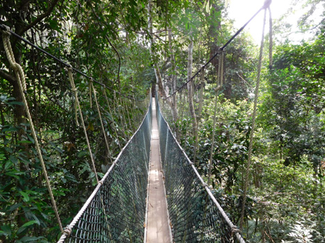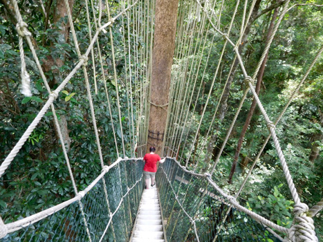 Die 60 Kilometer bis Kuala Tahan, dem Südeingang des Taman Negara Nationalparks legen wir auf unerwartet guter Straße rasch zurück. Nachdem sich die morgendlichen Nebel rasch gehoben haben, scheint heute einmal die Sonne. Gut, dass wir bald im schattigen Urwald verschwinden werden. Denn ein Dschungelspaziergang steht heute auf dem Plan. Wir besprühen uns wie die Wilden mit Insektenspray und packen in eine Tasche, was die Checkliste "Dschungelausflug" auflistet. Das ist natürlich ein Scherz, so eine Liste haben wir nicht. Das Boot, mit dem wir den Sungai Tembeling, der die Grenze des Nationalparks bildet, queren, und die Eintrittsgebühr in den Nationalpark sind super billig: Jeweils 1 Ringgit = 0,25 EUR. Der Nationalpark ist nicht nur einzigartig, weil er noch reichlich unberührten Primärdschungel aufweist, sondern weil man hier auf markierten Wegen den Urwald auf eigene Faust erkunden kann, man muss keinen Führer engagieren. Also nichts wie rein ins Vergnügen! Wer jetzt Angst hat, wir könnten uns im Urwald verirren, der sei beruhigt: Der Dschungel ist so dicht, dass man nicht einfach in jede beliebige Richtung gehen kann. Man kann eigentlich nur auf den angelegten Wegen wandern. Natürlich gibt es Abzweigungen, die sind aber meist mit Wegweisern versehen, so dass man echt dumm tun müsste, um sich zu verlaufen. Angesichts Susis eingeschränkter Mobilität wählen wir eine sehr kurze Variante, nämlich jene, die direkt zum Canopy Walkway führt. Die Flora ist großartig, es sind Pflanzen in jeder Größe nebeneinander vorhanden, wie es sich für einen Primärwald gehört. Manche Pflanzen kommen uns bekannt vor, einige gibt es zu Hause im Blumengeschäft als Topfpflanzen, andere haben wir noch nie gesehen. Die Fauna hingegen ist enttäuschend. Mit Elefanten und Tigern haben wir ohnehin nicht gerechnet, aber außer einem Affen, ein paar Mücken, Schmetterlingen und einzelnen Vögeln ist nichts zu sehen. Zwar wandern wir meist im Schatten, doch es geht ständig bergauf und bergab und vor allem ist es so feucht, dass wir bald in tropfnasser Kleidung gehen. Das kann sich keiner vorstellen, der das nicht erlebt hat. Der Canopy Walkway ist ein System von bis zu 70 Meter langen Hängebrücken, die in 20 bis 45 Metern Höhe von Baum zu Baum führen und uns einen tollen Einblick in die oberen Urwaldetagen gewähren. Die Brücken sind schmal und schwanken manchmal ziemlich wild, ein tolles Erlebnis. Außerdem ist hier oben ein sehr bescheidenes Lüfterl zu spüren. Zurück beim Gate geben wir uns auf einem schwimmenden Restaurant ein sehr verspätetes Mittagessen. Dann noch in praller Sonne zurück zum Auto. Wir sind total geschafft. Aber nach zehn Minuten im Zerberus mit voll aufgedrehter Klimaanlage, gut zwei Litern diverser Getränke und einem Kleidungswechsel sind wir wieder halbwegs fit. Nach nur kurzer Fahrt zurück Richtung Jerantut passiert das Unglaubliche: Der Turbo fällt aus. Das ist deshalb so unglaublich, weil der Turbo schon in China zweimal und in Myanmar und in Laos jeweils nochmals ausgefallen ist. In China haben wir das Abgasrückführventil reinigen, in Thailand wechseln lassen. Erst in Kuala Lumpur haben wir den Drucksensor im Luftfilterkasten reinigen lassen. Ich hoffe nun sehr, dass die Ursache diesmal wieder der Drucksensor ist, denn so einen hab ich in weiser Voraussicht jetzt gerade aus Österreich mitgebracht. Ich bleibe also stehen, Motorhaube auf, zwei Schrauben raus, Sensor raus, neuer Sensor rein, zwei Schrauben rein, Motorhaube zu. Und dann, als ich wegfahre und beschleunige, hört man die Spannung sprichwörtlich knistern. Fortsetzung nach der Werbung.