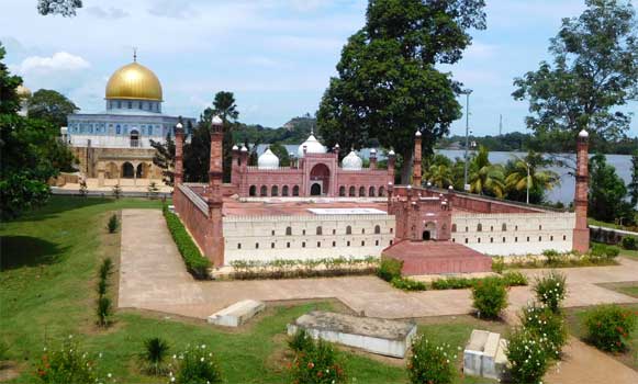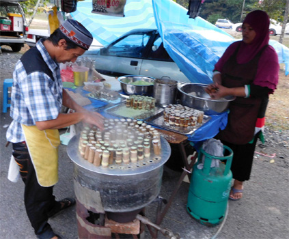 Wegen der nächtlichen Störung schlafen wir sehr lange und stehen erst auf, als die Hitze im Auto unerträglich ist. Wir frühstücken auf dem Parkplatz im Freien. Manche Passanten interessieren sich dafür, wo wir schräge Vögel herkommen, die meisten scheinen uns nicht wahr zu nehmen. Da die Region hier muslimisch dominiert ist, sollten heute am Samstag die Geschäfte eigentlich offen haben. Wir sollten doch langsam neue Bordbatterien kaufen. Google sei dank, ist ein großer Autobatterienhändler rasch gefunden. Der Chef spricht sehr gut englisch, kennt aber nicht einmal den Unterschied zwischen Starterbatterien und Versorgerbatterien. Da er nur Starterbatterien hat, wir auch keine Hoffnung haben, bei einem anderen Händler Versorgerbatterien zu erhalten, kaufen wir eben zwei Starterbatterien. Die hat er sogar in genau der richtigen Größe. Nun fahren wir zum Islamic Edutainment Park gleich neben der Kristallmoschee, wo die wichtigsten islamischen Bauwerke der Welt en miniature nachgebaut wurden. Sehr nett. Am Nachmittag sehen wir uns noch die am südlichen Stadtrand gelegene Schwimmende Moschee an. Sie schwimmt nicht wirklich, ist aber an einem kleinen See gelegen und sieht mit ein wenig Fantasie wirklich aus, als würde sie schwimmen. Da es hier einen schattigen Parkplatz mit sauber gekehrtem Asphalt gibt, erledige ich hier die schon länger ausstehenden Reparaturen. Ich entferne das als Provisorium montierte Plastik-Knie zwischen zwei Dieselschläuchen und ersetze es durch ein mitgebrachtes metallenes. Damit können wir wieder beide Dieseltanks benützen. Ich fülle Öl im hinteren Differential nach. Ups, da ging doch glatt ein halber Liter rein. Hätte man früher kontrollieren müssen! Und dann baue ich auch gleich die beiden neuen Bordbatterien ein, wozu wieder der ganze Kofferrauminhalt ausgeräumt werden muss. Blöderweise krieg ich einen Spritzer Batteriesäure in ein Auge. Brennt trotz sofortiger Augenspülung heftig und lange. Gleich nebenan feiert eine Gruppe Teenager unter Bäumen einen Geburtstag. Die Mädels haben Girlanden und Luftballons aufgehängt, sitzen auf Schilfmatten und haben Unmengen an Torten und Getränken mit, sogar ein riesiger Sack Eis ist dabei. Auch wir kriegen jeder ein Stück Torte. Auf der Küstenstraße fahren wir südwärts. Obwohl die Küste hier fast durchgehend verbaut ist, finden wir einen tollen, kaum einsehbaren Nachtplatz direkt am Strand. Es weht ein Lüfterl, gibt kaum Mücken, auch das Meer ist gerade da. Dazu noch Vollmond! Einfach perfekt. Von einem nahen Essensstand an der Straße kaufen wir uns gekochte Maiskolben und gedünstete Erdnüsse, ein einfaches, aber sehr leckeres Abendessen. Km 67/1.090/54.860.