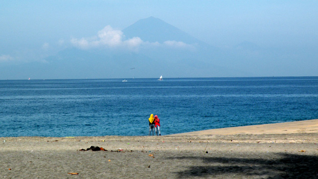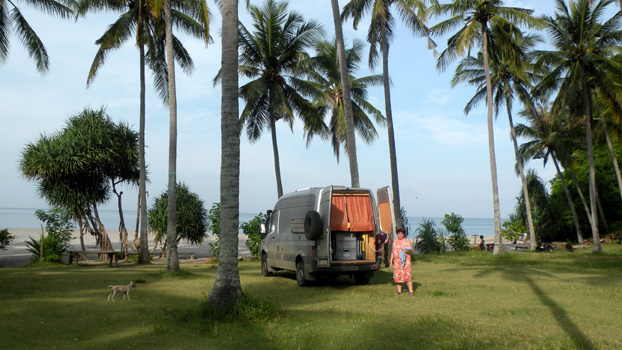 Von der Westküste Lomboks hat man einen schönen Bllick auf den Gunung Agung auf Bali, der aus den Wolken ragt. Nach nur kurzer Fahrt machen wir schon Badestopp an einem schönen Strand mit Palmen. Nach dem Duschen haben wir Ebbe in den Wassertanks. Bei einer Tankstelle gibt es kostenlos Nachschub. Der Schlauch ist dünn und so dauert die Befüllung. Nach einer Weile kommt der Tankwart, sieht sich das Auto von allen Seiten an und fragt mich, ob wir einen Swimmingpool drin haben. Wir umfahren nun die Insel auf der Nordseite. Im Nordosten hört plötzlich das Grün auf, das Gras ist verbrannt, dazu verdorrte Büsche und ausgetrocknete Flussbette. Anscheinend haben wir eine Art Wetterscheide passiert und hier fällt nicht viel Regen. Der Rinjani, der vor zwei Monaten noch eine große Aschewolke ausgehustet hat, hüllt sich in Wolken. Zu Mittag kommen wir nach Labuhan, von wo wir mit der Fähre nach Sumbawa übersetzen.