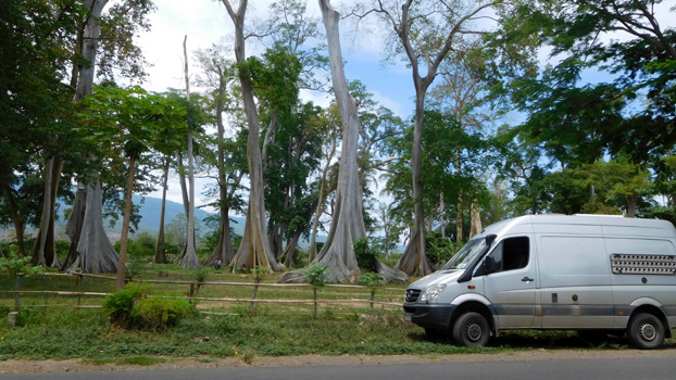 Obwohl die Entfernung zwischen den beiden Häfen unter 20 Kilometer beträgt, dauert die Überfahrt eine Stunde plus wieder 40 Minuten Warterei bis der Anleger frei ist. In Sumbawa ist offensichtlich die Regenzeit noch nicht angekommen. Es stehen keine Pfützen, alles ist staubtrocken, das Gras vielfach verbrannt. Saftiges Grün gibt es nur, wo bewässert wird. Wir fahren am Nordufer ostwärts. Meist gibt es Mangroven, die wenigen Strände sind von Ausflüglern belegt und reichlich vermüllt. An einen Nachtplatz am einsamen Sandstrand ist nicht zu denken. Wir übernachten im etwas herunter gekommenen Kencana Resort, wo wir kostenlos campieren dürfen, da wir hier Abendessen und morgen Frühstück einnehmen. Km 236/8.003/61.647.
