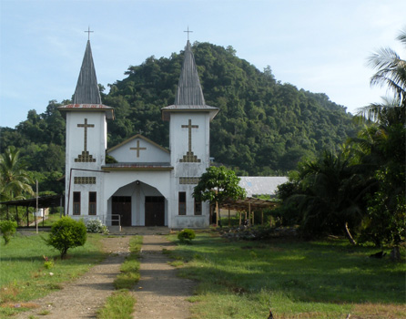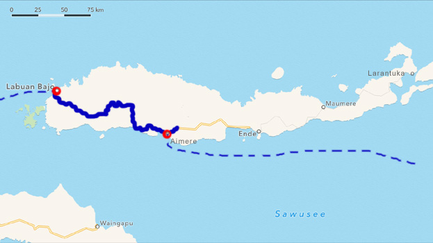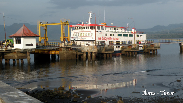 Um halb 3 kommen wir in Labuan Bajo an. Wir fahren nur aus dem Hafen raus, parken in einer Nebenstraße und schlafen noch eine Runde. Flores ist grüner als Sumbawa, aber gebirgiger und daher kurviger und die Straßen sind teilweise recht schmal. Die Trans-Flores-Straße verbindet auf zirka 700 Kilometern die beiden Enden der lang gestreckten Insel von Labuan Bajo bis Larantuka. Es gibt Kirchen, ein großer Teil der Bevölkerung ist katholisch. Vor Ruteng liegen beidseits der Straße so genannte Spinnennetzfelder, große kreisrunde Felder, die durch Erbteilung in sektorförmige Stücke geteilt wurden. Während eines starken Regens können wir das Leck an der Dachluke orten, das sollten wir bei nächster Gelegenheit abzudichten versuchen. Da uns die Kurverei zunehmend nervt, überlegen wir, nicht wie geplant, von Larantuka, sondern schon von Aimere nach Timor überzusetzen. Wenn die uns vorliegenden Informationen stimmen, sollte morgen Früh dort eine Fähre ablegen. Um halb fünf sind wir in Aimere und hören, dass das stimmt, die Fähre geht um acht, der Ticketschalter öffnet um sieben. Wir brauchen noch Bargeld. Bisher konnten wir mit unserer Bankomatkarte in jedem kleinen Dorf problemlos Geld vom Bankomaten beheben, aber Aimere ist kein kleinstes Dorf, sondern nur ein Hafen, möchte man sagen, doch auch das ist übertrieben, es ist eigentlich nur ein verfallender Fähranleger. Es gibt zwar eine Bank, doch akzeptiert deren Bankomat unsere Karten nicht. Auch Geld wechseln ist in dieser Bank nicht möglich. Eine Angestellte empfiehlt uns, 30 Kilometer zurück nach Borong zu fahren. Mist! Dieses Stück war ja extra kurvig und die Straße extra schmal, das dauert über eine Stunde. Ich frage, wo der nächste Bankomat in der anderen Richtung ist. In Bajawa. Wie weit ist das? 30 Kilometer. Wie lange fährt man? Eine Stunde. Gehüpft wie gesprungen. Wir fahren nach Bajawa, das wir bei Dämmerung erreichen, beheben Geld, essen zu Abend und fahren wieder gut eine Stunde zurück. Km 307/8.622/62.266.