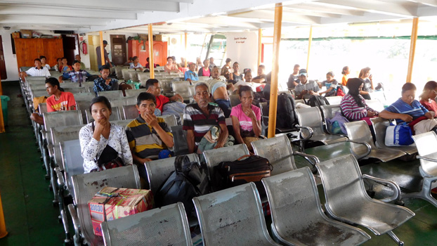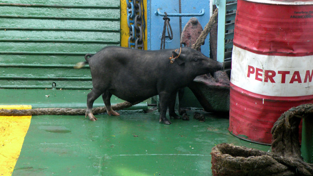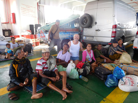Die Fähre ist nur schwach ausgelastet. Außer uns fahren nur drei kleine LKW, zwei PKW und einige Motorräder auf den Kahn. Zudem transportiert das Schiff vielleicht 50 oder 60 Fußpassagiere und deren Gepäck: dutzende mit Schnüren gesicherte Schachteln, zehn oder zwölf Säcke Reis, ein Schwein und zwei Hähne. Da das Fahrzeugdeck halb leer ist, machen es sich viele Passagiere hier auf ausgebreiteten Decken oder Matten gemütlich, Camping an Bord quasi, eine Alternative zu den engen und unbequemen Metallsesseln auf dem Passagierdeck. Bald sitzen auch wir auf unseren Klappstühlen neben dem Zerberus und lesen. Am Nachmittag klettere ich auf den neben unserem Wohnmobil stehenden LKW, von wo ich bequem die Roststellen am Zerberus erreiche, die ich schon lange behandeln wollte. Ich schmirgle den Rost bis aufs Blech weg und lackiere zwei Mal drüber. Als wir uns zum Pennen ins Auto verziehen, liegen viele schon auf ihren Matten ausgestreckt am Boden. Das Schwein liegt reglos in einer Ecke, wo man es angebunden hat und die Hähne krähen wie schon ganzen Tag noch immer um die Wette. Km 1/8.623/62.267.