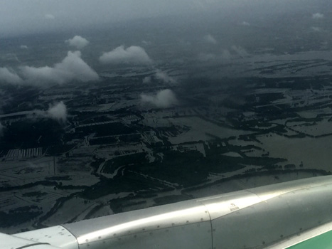 Via Surabaya fliegen wir nach Jakarta. Im Landeanflug sieht man, dass weite Landstriche überflutet sind. Bevor wir aus dem Flugzeug aussteigen, werden wir per Durchsage informiert, dass der Flieger wegen Regen nicht andocken kann und wir am Heck über eine Treppe aussteigen müssen. Dort werden dann Regenschirme ausgegeben und wir müssen zu Fuß zum Flughafengebäude gehen. Noch eine schräge Sache ist, dass wir mit einem Shuttlebus vom nationalen zum internationalen Terminal fahren müssen und sich der Bus dabei durch den öffentlichen Verkehr quälen muss. Gut, dass wir reichlich Zeit haben, bis wir nach Bangkok weiter fliegen.