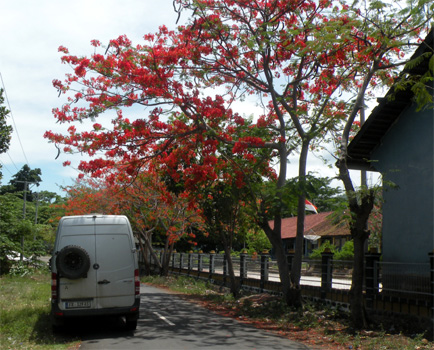 Um 2 Uhr, nach 18 Stunden Fahrt legen wir in Kupang an. Der Hafen ist weit außerhalb. Wir fahren auf gut Glück Stadt einwärts und finden einen halbwegs ruhigen Parkplatz zum Weiterschlafen. Nach dem Frühstück machen wir uns gleich auf die Suche nach einem Einstellplatz für den Zerberus. Von Michael haben wir bereits eine Zusage, dieser Platz ist aber im Freien und das wollen wir diesmal keines Falls, da ja bald die Tropenstürme kommen (können) und wir außerdem nicht wissen, ob die Dachluke nach der Reparatur dauerhaft dicht ist. Außer Michael haben wir zwei weitere Kontakte, die allerdings beide nicht auf Mails bzw. Facebook-Anfragen reagiert haben. Zuerst fahren wir zu einem Restaurant, wo E. arbeiten soll. Vor dem Restaurant sitzen zwei Männer an einem Tisch, der den ich anspreche, ist E. Er bietet mir an, das Auto in dem kleinen Garten vor dem Restaurant abzustellen, da sei es sicher. Der Platz ist natürlich total in der Auslage und Dach ist auch keins drüber. Was anderes weiß er nicht. Ich lasse nicht locker und sage ihm, ich hätte gehofft, er würde ein paar Freunde anrufen und vielleicht rufen die wieder ihre Freunde an ... Da fragt er den anderen am Tisch und der weiß auch tatsächlich einen Platz und bringt uns auch gleich hin. Es ist bei ihm zu Hause, etwas außerhalb der Stadt unter einem stabilen Vordach. Gartenzaun, Hund, außerhalb der Tsunami-Zone, nicht ganz billig, aber passt. So schnell ist es auch noch nie gegangen. Nun machen wir den Fehler und suchen noch unseren anderen Kontakt auf, den Zweigstellenleiter einer Reiseagentur. Wir müssen kurz auf ihn warten, dann kommt er mit einem rauchenden Geländewagen angefahren. Er ist sehr bemüht, uns zu helfen und schlägt vor, auf dem Grundstück seines Hauses ein Carport zu bauen. Dafür nennt er uns einen sehr günstigen Preis, Miete will er keine, er hat ja dann das Carport. Jetzt sind wir natürlich in der Zwickmühle, wissen nicht, welcher Platz der bessere ist. Wir entscheiden uns dann aber für den ersten, ist irgendwie eine Bauchentscheidung. Beim Tanken sehe ich, dass ein Reifen eine üble Beule aufweist. Das ist vermutlich auf der letzten Fähre passiert, da sind blöde Eisendinger aus dem Boden gestanden und die Verletzung erinnert an jene, die sich ein Reifen zugezogen hatte, als wir in Darjeeling auf den Eisenbahnschienen fahren mussten. Gleich der erste Reifenhändler hat einen passenden Reifen da! Die Glücksträhne hat dann aber beim Buchen des Nachhausefluges ein jähes Ende: Es gibt einen einzigen Flug von Jakarta, dessen Preis und Flugdauer akzeptabel sind. Und der lässt sich nicht buchen. Einmal reißt die Internetverbindung ab, dann antwortet die Buchungsseite nicht, schließlich akzeptiert die Seite meine Kreditkarte nicht, auch Susis Karte nicht, bei Buchung über ein österreichisches Reisebüro (danke für den Versuch, Anna) kostet der Flug fast das fünffache, auch die von der ThaiAirways-Hotline angebotene Lösung funktioniert nicht, ein weiterer Versuch scheitert daran, dass das Buchungsbüro in Jakarta um 17 Uhr schließt. Neuer Versuch morgen Vormittag! Wir haben uns übrigens in einem einfachen Hotel in Flugplatznähe einquartiert. Km 85/8.708/62.352.