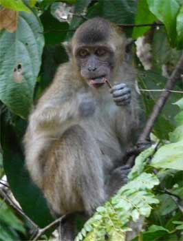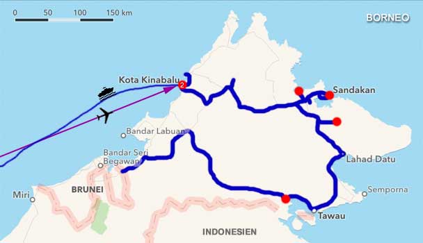 Nasenaffen gibt es nur auf Borneo. Das Proboscis Monkey Sanctuary liegt in einem Mangrovenwald an der Labuk Bay. Auf Holzstegen kann man zu zwei Fütterungsstationen gehen, wo die Nasenaffen zu festgelegten Zeiten gefüttert werden, damit man sie zu Gesicht bekommt. Die Futtermenge ist aber so gering, dass sie sich wohl das meiste Futter selbst suchen müssen. Die Affen bilden Gruppen, hier eine Familie, da eine Gruppe Single-Männchen, und es scheint eine strenge Hierarchie zu geben. Später sehen wir uns noch die Malaienbären im Bornean Sun Bear Conservation Center an und zum Schluss statten wir dem Orang Utan Rehabilitationszentrum (Orang Utans gibt es nur mehr auf Sumatra und Borneo) einen Besuch ab. Auch hier wird täglich zur gleichen Zeit Futter angeboten. Meist kommen Orang Utans, es gibt aber keine Garantie. Heute kommen knapp zehn. Sie hangeln sich an zur Futterplattform gespannten Seilen entlang, auch einige Junge sind dabei. Es ist eine Freude, zuzusehen wie die Affen mit ihren langen Gliedmaßen geschickt herumturnen. Mit dem Wetter haben wir echt Glück heute, der Regen beginnt erst am Abend. Wir fahren noch nach Sandakan, wo wir im Hof der Pfarre St. Mary übernachten. Im Auto hat es 32 Grad. Fenster müssen zu bleiben, weil's so schüttet. Km 58/2.980/56.748.