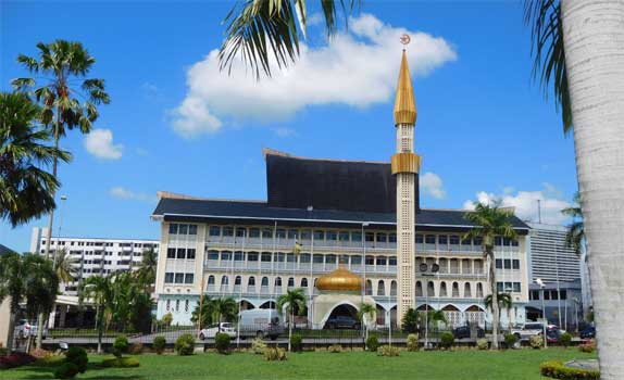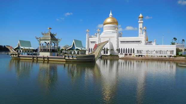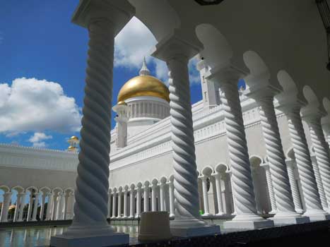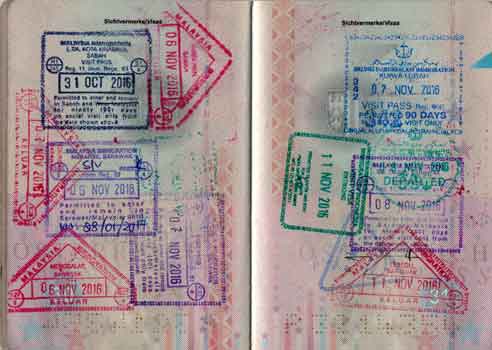 Das kleine Sultanat an der Nordküste Borneos besteht aus zwei nicht zusammen hängenden Teilen, die beide von der malaysischen Provinz Sarawak umschlossen sind. Da die Fernstraße von Kota Kinabalu nach Kuching durch beide Teile Bruneis und den dazwischen liegenden Teil Malaysias führt und man auch beim Passieren der Provinzgrenze zwischen Sabah und Sarawak Passkontrollen wie bei einer Staatengrenze durchlaufen muss, erhält man, wenn man durchfährt innerhalb weniger Stunde zehn (!) Stempel in den Pass.