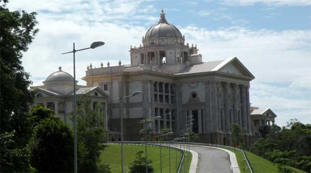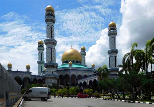 Nach nur zirka 15 Kilometern sind wir schon an der nächsten Grenze, verlassen den östlichen Teil Bruneis und reisen wieder in Malaysia ein. Wir kriegen den fünften und sechsten Stempel in den Pass, zwei Minuten. Wir machen uns nicht die Mühe, einen Zöllner für's Carnet zu suchen. Und dann nach 35 Kilometer das gleiche Spiel nochmals, wir verlassen Malaysia, reisen in den westlichen Teil Bruneis ein und erhalten Stempel sieben und acht. Eine Versicherung für Brunei kann man nicht abschließen. Wir fahren ins Zentrum von Bandar Seri Begawan, der Hauptstadt Bruneis, wo kaum Menschen auf den Straßen zu sehen sind. Autos sind reichlich unterwegs. Irgendwo haben wir mal gelesen, dass die Menschen hier auch kleinste Strecken mit dem Auto zurücklegen, um ständig eine Klimaanlage um sich zu haben. Wir sehen uns zunächst ein Kampong Ayer an, ein Dorf, das auf Stelzen im Fluss errichtet ist. Die Häuser haben alle Wasserleitung und Strom, manche Kampong beherbergen sehr noble Häuser, das Dorf, das wir uns ansehen, eher nicht. Nun besichtigen wir die große Jame Asr Hassanil Bolkiah-Moschee, die mit goldenen Kuppeln und vier hohen Minaretten, jeweils wieder mit Kuppel, beeindruckt. Die Fassade ist von Millionen Mosaiksteinen bedeckt, innen ist alles aus Carrara-Marmor, die Kuppeln der beiden Gebetsräume für Männer und Frauen wunderschön verziert, darunter jeweils ein riesiger Kristallluster hängend. Susi hat sich für den Moscheebesuch züchtig angezogen, bodenlanger Rock und Umhangtuch, das Haare und Arme verdeckt. Jeder iranische Sittenwächter hätte eine Freude, aber hier gelten andere Regeln: Kopfbedeckung muss gar nicht sein, aber ein schwarzer Umhang, den man vom Portier ausleihen kann, ist nötig. Nach dem Mittagessen - Brunei ist ein teures Pflaster! - sehen wir uns das berühmteste Bauwerk Bruneis an, die Sultan Omar Ali Saifuddin-Moschee, ein strahlend weißer Bau mit in der Sonne glänzenden goldenen Kuppeln, davor in einem Teich der steinerne Nachbau einer antiken königlichen Barke. Ja, richtig gehört: in der Sonne glänzend. Heute ist supertolles Schönwetter, die Sonne heizt runter, 36 Grad. Von der Istana Nurul Iman, der angeblich größten Palastanlage der Welt, sehen wir leider nur die Dächer, da sie in einem riesigen Park gelegen ist und wir die persönliche Einladung des Sultans leider gerade verlegt haben. Nordwestlich der Stadt gibt es schöne Sandstrände, von denen wir einen ansteuern. Der ist echt super: breiter Sandstrand, Bäume und kein Mensch da. Leider scheuchen wir sofort Mücken aus dem Gras und kriegen einige Stiche ab, oder sind es Sandflöhe? Das wäre auch nicht besser. Ein Stück weiter gibt es kein Gras und auch keine Mücken. Wir nehmen ein herrlich erfrischendes Bad, wählen aber zum Übernachten einen beleuchteten Picknickplatz ein Stück weiter. Km 179/4.171/57.939.