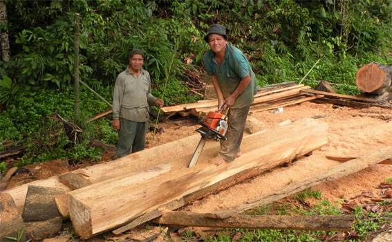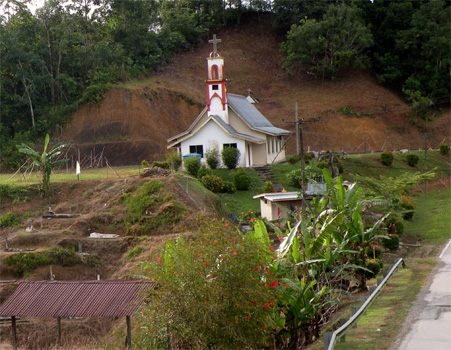 Mit einem Boot queren wir den Sungai Sarawak, um uns das alte Fort anzusehen. Wir sind die einzigen Fahrgäste. Um mich nicht über's Ohr hauen zu lassen, frage ich den Bootsführer nicht, was es kostet, sondern gebe ihm zwei Ringgit (0,45 Euro). Da er nicht mehr verlangt, wird's wohl gepasst haben. Vor der Rückfahrt sagt mir eine junge Frau, die auch mitfährt, auf meine Frage, dass ein halber Ringgit der übliche Preis ist. Eigentor. Der Zerberus bringt uns nun zu weiteren Sehenswürdigkeiten auf der Nordseite der Stadt. Wir spazieren durch den sehr nett angelegten Orchideengarten, sehen uns die Staatsmoschee an, für deren Besuch wir uns in dunkle Kutten hüllen müssen, bestaunen die Koranschule mit persischer Kuppel und statten dem Katzenmuseum einen Besuch ab. Dabei handelt es sich nicht, wie angenommen, um ein kleines Privatmuseum, sondern um ein von der Stadt Kuching unterhaltenes, in einem riesigen wie eine Raumkapsel aussehenden Gebäude untergebrachtes Museum. Unglaublich, was man zum Thema Katzen sammeln kann: Ausgestopfte Tiere, Skelette, Porzellanfiguren, Spielzeug, Karten, Briefmarken, Katzenfutter, Katzenklo, Katzenmumien, Hello Kitty, Garfield ... Bevor wir die Stadt verlassen, tätigen wir noch einen Einkauf. Alkohol soll ja in Indonesien noch schwieriger zu bekommen sein als hier in Malaysia. Wer weiß, ob es in der abgelegenen Gegend, in der wir in den nächsten Tagen unterwegs sein werden, Brot gibt? Oder Butter oder Käse. In Supermärkten ist, wenn überhaupt, Alkohol in der allerletzten Ecke ein einem separaten Raum zu finden. Erinnert irgendwie an Videotheken (für die ganz Jungen: das sind Geschäftslokale, in denen man früher DVDs ausleihen konnte), fehlt nur der Vorhang. Bier gibt es ab 6 Ringgit ( 1,35 Euro) je 330 ml-Dose, Wein ist noch teurer als Schnaps, weit jenseits der zehn Euro die Flasche. Wir fahren nun von Kuching nach Süden und steuern ein Dorf namens Annah Rais an, in dem es drei alte Langhäuser geben soll. Die gibt es auch, aber sie sind bei weitem nicht so beeindruckend, wie jene der Iban, weil sie nicht als ein Gebäude imponieren, sondern wie aneinander gebaute Einzelhäuser. Eines der Häuser ist mit "Headhouse" beschriftet und ist nicht, wie vermutet, das Büro des Bürgermeisters, sondern beinhaltet einen Raum, in dem sich in einem von der Decke hängenden Drahtkorb mehrere Totenschädel befinden. Auf einer Nebenstraße geht es Richtung Grenze, öfter mal fehlt die halbe Straße. Abgerutscht mitsamt Leitplanke, sofern vorhanden. Wir treffen Männer, die einen großen Baum neben der Straße gefällt haben. Da sie keinen LKW zum Abtransport des Holzes haben, schneiden sie den Stamm gleich hier mit der Motorsäge in Bretter. In einem winzigen Dorf mit aus der Ferne nett aussehender, bei näherem Hinsehen renovierungsbedürftiger Kirche halten wir und fragen, ob wir hier übernachten dürfen. Dürfen wir. Ein alter Mann, dem ein winziger Laden gehört, hat diesbezüglich das Sagen. Im Gegenzug tätigen wir einen Einkauf, erstehen noch ein paar chinesische Bierdosen, die billiger sind als das Carlsberg aus dem Supermarkt, Kekse und Einmalrasierer. Trocken Rasieren geht ja schon lange nicht mehr, weil die Haut nie trocken und der Elektrorasierer ständig verklebt ist. In dem Dorf ist es total ruhig. Natürlich gibt es Geräusche, Stimmen, Kinder, Grillen, ein Moped, einmal in der Stunde ein Auto, aber es gibt keine Hintergrundgeräusche, keinen dauernden Verkehrslärm. Wir genießen es! Km 122/5.269/59.036.