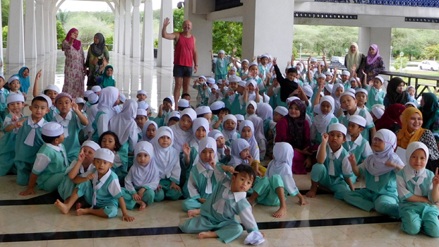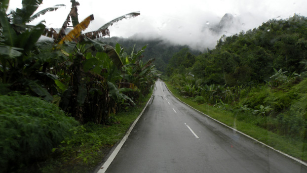 Der Tag begrüßt uns mit einer Reifenpanne. Es verabschiedet sich nun auch der zweite der beiden Reifen, deren Mantel wir in der Wüste Gobi in einem trockenen Flussbett schwer beschädigt hatten. Ich habe noch die Geistesgegenwart, den Zerberus auf eine Stelle mit festem Untergrund zu lenken, damit der Wagenheber nicht im vom Regen aufgeweichten Bankett versinkt. Bald sind wir an der Grenze. Erfreulicher Weise gibt es noch eine Tankstelle; Diesel ist in Indonesien angeblich viel teurer. Die Grenzabfertigung auf malaysischer Seite geht halbwegs geordnet vonstatten, beim Immigration-Schalter muss man ziemlich lange anstehen, ein Zöllner wirft einen Blick ins Wohnmobil.