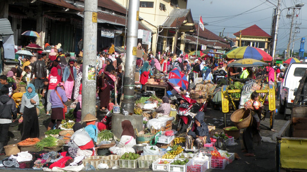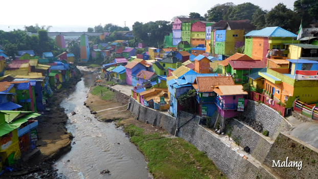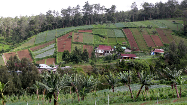 Da der Tempel auch um sieben noch nicht geöffnet ist, müssen wir uns jemanden suchen, der den Schlüssel hat. Der Tempel ist nicht spektakulär, aber seine erotischen Darstellungen sind außergewöhnlich. Die Straße führt nun den Gunung Lawu, einen 3.200 Meter hohen Vulkan bis zu einer Passhöhe auf etwa 1.800 Metern hoch. Auf den Hängen sind, teils in Terrassen, Gemüsefelder angelegt. Die Arbeit muss von Hand getan werden. Die weitere Fahrt ist unspektakulär bis eintönig. Am Nachmittag kommen wir nach Batu, wo es einen Aussichtsberg geben soll, von dem man auf die 300 Meter tiefer liegende Stadt Malang blickt. Leider finden wir die Zufahrt lange Zeit nicht, Google schlägt uns Wege vor, die bestenfalls mit einem Fahrrad passierbar sind. Als wir dann endlich richtig sind, müssen wir umdrehen, weil die Serpentinen für den Zerberus zu eng sind. Als wir in Malang ankommen, ist es bereits dunkel und die Nachtplatzsuche ist eine echte Herausforderung. Eher zufällig landen wir auf dem Hof der Katholischen Kirche, wo wir übernachten dürfen. Zur Heiligen Messe um 5 Uhr dreißig sind wir eingeladen. Km 269/6.665/60.310.