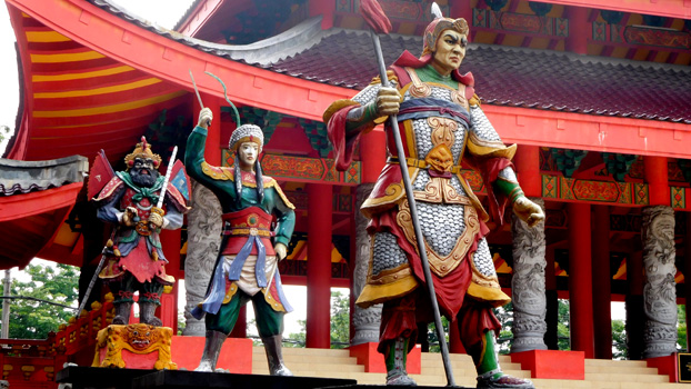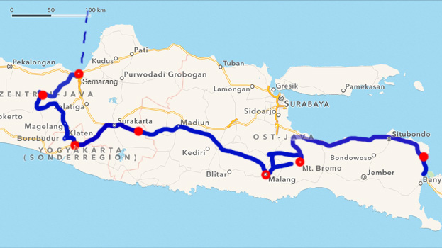 Die Strecke führt vor Parakan zwischen Gunung Sundoro und Gunung Sumbing, zwei über 3.000 Meter hohen Kegelvulkanen, hindurch. Bei großer Hitze sehen wir uns Borobudur an, das größte buddhistische Bauwerk der Welt, streng genommen kein Tempel, da es keinen Innenraum beherbergt. Es ist ein in Stufen ausgeführter Pyramidenbau mit einer Seitenlänge von über 100 Metern. Man kann den Bau über Stufen besteigen und auf jeder Ebene herumgehen. Die Außenflächen sind über und über mit Steinreliefs und Buddhafiguren verziert und auf den obersten Etagen befinden sich die berühmten glockenförmigen durchlöcherten Stupas. Zwei weitere kleinere Tempel in der Nähe, Candi Powon und Candi Mendut, sind vergleichsweise unspektakulär. Am Nachmittag sind wir in der 1,6 Millionen Einwohner zählenden Stadt Yogyakarta. Da es im Zentrum keine Parkplätze gibt, fahren wir die paar Plätze ab, die ich in Google Earth gefunden habe. Schon beim zweiten haben wir Glück, der Platz beim Museum Pura Pakualaman eignet sich sogar zum Übernachten. Das Zentrum ist mit einer Fahrradrikscha in zehn Minuten erreichbar. Leider hat die Palastanlage Kraton schon zu, so dass wir uns mit einem Spaziergang durch die Malioboro-Road, die Mariahilfer Straße quasi, zufrieden geben müssen. Zwischen tausenden Souvenirständen, die alle den gleichen Ramsch verkaufen, finden wir die vermutlich kleinste McDonalds-Filiale der Welt, zirka vier Quadratmeter groß, es gibt nur Eis. Km 142/6.257/59.902.