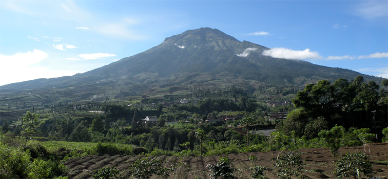 Gleich in der Früh sehen wir uns die Kathedrale an, deren auffälligstes Merkmal die Turmspitze ist, die an die Spitzen von Stupas in Nepal und Laos erinnert. Nur ein paar Schritte weiter befinden sich an einem großen Kreisverkehr mehrere Kolonialbauten, am auffälligsten das Lawang Sewu, das Gebäude der niederländischen Eisenbahngesellschaft, heute teils ein Museum, teils leer stehend. Weil er auf dem Weg liegt, sehen wir uns den großen chinesischen Tempel Klengteng Sampo Kong an. Man bezahlt ein kleines Eintrittsgeld, doch mit dem Ticket darf man nur auf das Gelände, für den Tempel muss man nochmals ein Ticket lösen, allerdings zum dreifachen Preis des ersten. Beim Rausfahren vom Parkplatz kassiert man noch für's Parken. Seltsame Sitten sind das. Beim Tanken stellen wir fest, dass es unrichtig ist, dass Diesel in Indonesien teurer ist als in Malaysia. Im Gegenteil, er ist deutlich billiger, kostet nur 0,36 Euro. Unser nächstes Ziel ist das Dieng-Plateau. Wir nehmen nicht die in großem Bogen verlaufende Hauptstraße, sondern eine "Abkürzung", eine schmale Straße, die sich durch die Berge windet und einen guten Einblick in die intensive Landwirtschaft bietet. Jedes Fleckchen Boden ist genutzt, vielfach sind Terrassen angelegt, es wird bewässert. Reis, Mais, Bananen, Gemüse, in höheren Lagen auch Kartoffeln und noch weiter oben sogar Tee, werden angebaut. Und manches, das wir gar nicht kennen. Das Dieng-Plateau ist der auf gut 2.000 Meter gelegene ebene und landwirtschaftlich genutzte Boden des Kraters eines erloschenen Vulkans. Der Krater ist heute nur mehr von bestimmten Punkten zu erahnen. Die Auffahrt auf das Plateau ist, da wir ja nicht die übliche Straße genommen haben, schlecht. Und eng. Und steil. Und rutschig, weil es schon wieder regnet. Auf dem Plateau gibt es Reste von Ruinen alter Paläste und Hindu-Tempel aus dem 7. und 8. Jahrhundert, mehrere bei Schönwetter bunt schillernde Seen und als Relikte des Vulkanismus Schwefelquellen, deren Dampf schon von weitem sichtbar und riechbar ist. Normaler Weise bezahlt man überall Eintritt, aber bei dem schlechten Wetter kassiert niemand. Wir überlegen kurz, auf dem Plateau zu übernachten, denken aber, dass es in der Nacht zu kalt wird, es hat am Nachmittag nur 15 Grad. Wir fahren also talwärts und finden dann in einem Dorf auf 1.400 Meter eine Art offene Garage, in der wir übernachten dürfen. Heute nehme ich die Verkleidung der vorderen Dachluke ab, um zu sehen, woher das ins Auto eindringende Wasser gekommen sein könnte, finde aber nichts auffälliges. Im Restaurant, wo wir zu Abend essen, treffen wir einen Indonesier, der gut deutsch spricht, er hat zwölf Jahre in Deutschland gearbeitet und zeigt uns stolz seinen EU-Führerschein. Obwohl es täglich Reis gibt, wird das Essen nicht fad, im Gegenteil, es gibt immer wieder Neues zu entdecken. Mittlerweile esse ich kaum mehr Fleisch, weil mir Grünzeug, Blätter und Sprossen viel besser schmecken. Km 121/6.114/59.760.