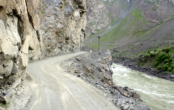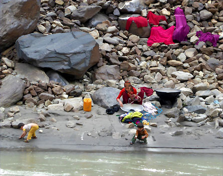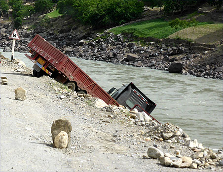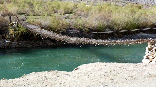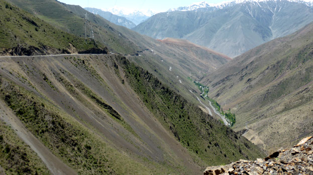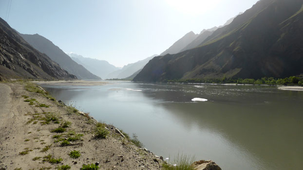 Der Pamir-Highway ist nach dem Karakorum-Highway in China und Pakistan die zweithöchste befestigte Straße der Welt. Sie ist prinzipiell durchgehend asphaltiert, habe ich gelesen. Wir können uns heute davon überzeugen, dass dem nicht so ist. Zu Mittag stoßen wir in Khalaikum auf den Highway, der, ähnlich wie die Straße davor, in weiten Abschnitten nicht geteert ist. Da der Zerberus kein Geländewagen und recht hart gefedert ist, kommen wir nur langsam voran. Am Abend beträgt die Durchschnittsgeschwindigkeit des Tages 26 km/h. Mal gut achteinhalb Stunden reine Fahrzeit macht gerade mal 225 Kilometer. Immer wieder staunen wir, dass Sattelschlepper die stellenweise sehr schmale und oft recht steile Straße fahren. Den ganzen Tag haben wir links Berge, rechts den Panj und drüben in Afghanistan meist auch eine Straße oder zumindest einen Weg und ebenfalls Berge. Das Tal ist oft so schmal, dass wir recht genau beobachten können, was in Afghanistan vor sich geht. Wir sehen Frauen beim Teppich Waschen, Kinder in der Schule und beim Fußballspiel, Menschen auf dem Weg, zu Fuß mit Lasten auf dem Kopf oder begleitet von Lasteseln, auf Mopeds, fallweise mit Autos. Aber auch herüben in Tadschikistan gibt es Interessantes zu sehen: Kühe, die wie Gemsen auf steilsten Geröllhalden Halme suchen, später wiederkäuend am Straßenrand liegen, Pferde mit frisch geworfenen Fohlen, Menschen, die mit einfachsten Werkzeugen auf dem Feld arbeiten. Km 225/15.454.