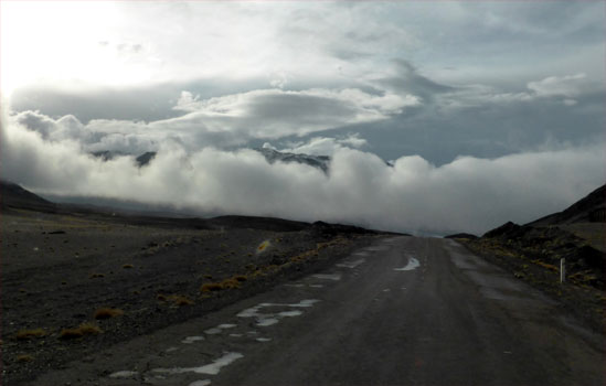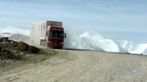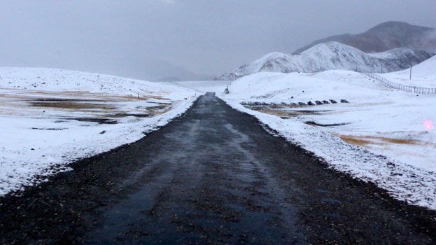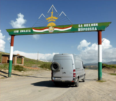 In der Früh hat es minus eineinhalb Grad, nicht so schlimm, wie erwartet. Es hat ein wenig geschneit und wir können uns nicht vorstellen, dass der Pamir-Highway auch im Winter befahrbar sein soll. Die Wolken hängen tief und wieder ist nichts zu sehen von einem Bergpanorama. Die Grenze zu Kirgisistan liegt auf 4.292 Meter, die Infrastruktur ist sehr einfach: Kein Strom, kein Telefon. Die Abfertigung ist unkompliziert und in einer halben Stunde erledigt.