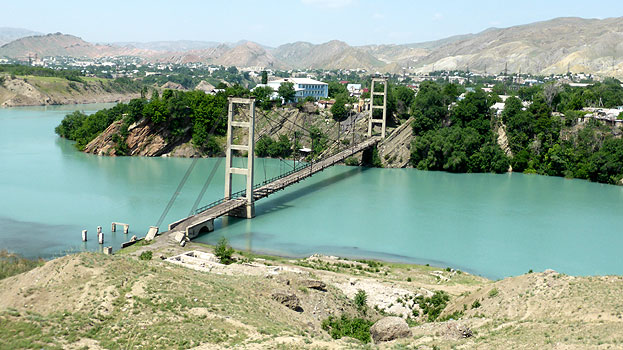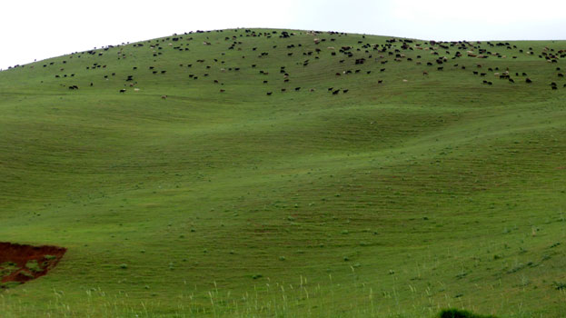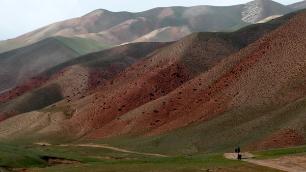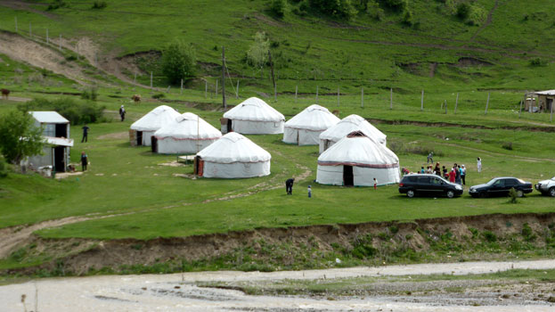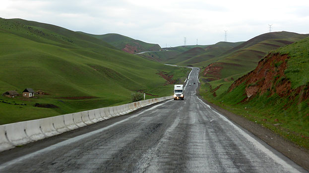 Auf einer sehr schlechten Piste fahren wir etwa eine Stunde (!), bis wir die kirgisische Grenzstelle erreichen. Die Abfertigung erfolgt in drei Schritten: Erstens Personenkontrolle mit Blick ins Auto und Stempel in den Pass, zweitens Drogenkontrolle mit der Frage, ob Drogen an Bord und ohne Blick ins Auto und drittens Zollkontrolle ebenfalls ohne Blick ins Auto. Dauer der Prozedur eine halbe Stunde. Wir rumpeln noch eine Weile auf einer Wellblechpiste dahin, bis der Asphalt anfängt, der ab Sary Tash einsame Klasse ist. Wir überwinden noch ein paar Pässe, dann geht es kontinuierlich bergab bis Osh, das auf 1.000 Metern liegt. Überall ist es grün, Schafe, Kühe und Pferde weiden. Immer wieder sehen wir zwischen den Dörfern Jurten, aber auch Wohnwägen, einzeln oder in kleinen Gruppen aufgestellt. Zu Mittag essen wir in einem Restaurant, in dem die Wirtin mit der Umrechnung von Som in Dollar nicht klar kommt: 1 Dollar = 50 Som, 537 Som = 110 Dollar. Ich muss zur Bank fahren und Geld wechseln, weil ihr 11 Dollar zuwenig scheinen. Am Nachmittag erreichen wir Osh, das uns mit freundlichen 28 Grad erwartet. Endlich gibt es Internet und ich kann mit meinem Mercedes-Spezialisten in Österreich telefonieren. Er meint, dass wir die 600 Kilometer nach Bishkek mit dem Loch im Katalysator und leuchtendem Motorkontrolllicht fahren können. Dort gibt es angeblich eine "richtige" Werkstätte für unseren Zerberus. Eventuell sollten wir zuvor den Auspuff ausbauen und ihn von den Bruchstücken des zerstörten Katalysators reinigen. Wir übernachten außerhalb von Osh. Ich lege mich nochmals unters Auto und entscheide, den Auspuff in Ruhe zu lassen, weil das Loch im Katalysator ohnehin fast so groß ist, wie der Auspuffquerschnitt. Wir lassen alles zusammen in Bishkek machen. Diesel kostet in Kirgisistan 0,66 Euro. Am Abend leere ich noch ein Glas Bier über mein Notebook, unglaublich, was dieses alles aushalten muss, die ständige Rüttelei ist bestimmt auch nicht ohne. Km 282/16.407.