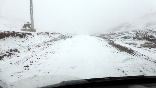 Wir fahren also nach Bishkek und müssen dabei einige über 3.000 Meter hohe Pässe überwinden. Prinzipiell hat der Zerberuns Kraft, nur fängt er manchmal ganz heftig zu vibrieren an, speziell auf Steigungen. Dann nehme ich den Fuß vom Gas, schalte runter, wenn's weiter vibriert, nochmals, manchmal geht es nur im Schritttempo voran, aber nach einiger Zeit kann ich problemlos wieder hochschalten. Die Landschaft ist echt grandios, viel Grün, weite Sicht, schneebedeckte Berge in der Ferne. Pferdeherden (Pferde werden hier gegessen), Schafe, Rinder, Jurten. Gegen Abend erreichen wir Bishkek. Auf der Stadteinfahrt werde ich an einer Polizeikontrollstelle angehalten. Ich habe das Verkehrszeichen Engstelle missachtet. Ich habe es zwar gesehen, aber keine Engstelle gesehen und bin daher auf dem linken Fahrstreifen weitergefahren. Es war aber so gemeint, dass alle am rechten Fahrstreifen an der Kontrollstelle vorbeifahren müssen. Macht 50 Dollar in die Schwarzkassa, ansonsten Anzeige. Ich biete 5 Dollar, der Polizist geht auf 35 runter. Ich bleibe bei 5, er sagt 25. Ich sage nein, sonst geh ich telefonieren. Darauf reduziert er auf 10, ich bleibe bei 5, er akzeptiert 5. Ich öffne die Geldtasche, hab aber nur drei Dollar und einen Fünfziger drin. Ich werfe ihm die drei Dollar auf den Tisch, krieg meinen Führerschein wieder und Abfahrt. Obwohl wir die Adresse der Mercedes-Werkstatt in Bishkek haben, finden wir sie in der Dunkelheit nicht. Wir übernachten auf dem Parkplatz eines Supermarktes. Km 679/17.086.
