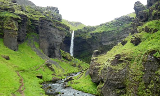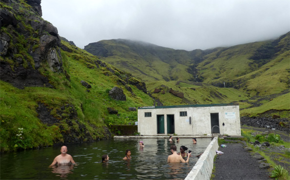 Heute nieselt es den ganzen Tag fast durchgehend. Wir sehen uns zunächst den letzten Gletscher in der Gegend an, den Sólheimajökull. Dann geht es weiter nach Skógar, wo die zwei Wasserfälle Kvernufoss und Skógafoss, sowie ein riesiges (ein ganzes Dorf ist Museum!) ausgezeichnetes historisches, naturwissenschaftliches und technisches Museum auf uns warten. Ein Stück weiter gibt es ein Freibad, in dem man in Thermalwasser baden kann. Was macht es da, dass es regnet? Das Bad Seljavallalaug wurde 1923 errichtet (sieht auch so aus) und ist durch einen längeren Fußmarsch und eine Bachquerung erreichbar. Zum Abschluss des Tages sehen wir uns noch die beiden Wasserfälle Seljalandsfoss und Gljúfrabúi an. Wir übernachten an einer Raststätte in Hvolsvöllur. Km 85/784/2.716/138.363.