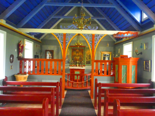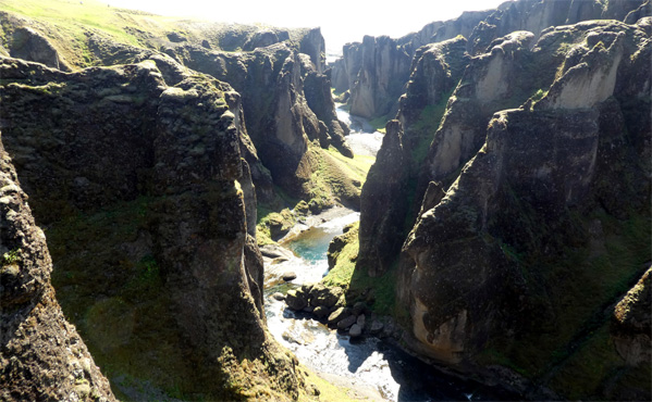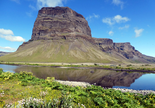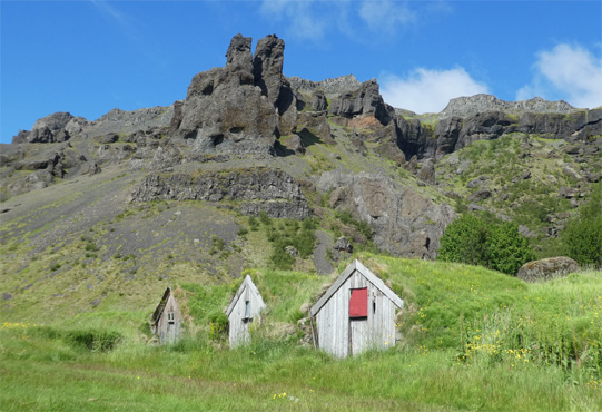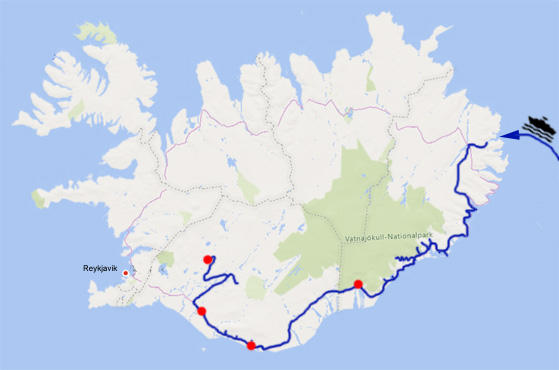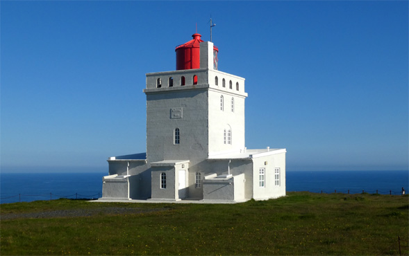 Leider sind unsere Bordbatterien (schon wieder!) am Ende. Am Morgen ist nicht mehr genug Saft für die Heizung drin. Wir lösen das Problem höchst elegant, indem wir über Nacht den Kühlschrank abschalten, dann können wir in der Früh heizen. Heute scheint schon am Morgen die Sonne und wir werden warme 18 Grad bekommen. Über viele Kilometer durchfahren wir Sander, flaches und ödes Schwemmland. Dann halten wir in Nupsstadur, einem idyllisch am Berghang gelegenen, stillgelegten, alten Bauernhaus mit Torfkellern und einer winzigen Kirche samt Friedhof. In Kirkjubæjarklaustur gibt es mitten auf einer Wiese ein "Kirkjugólf" genanntes, wie mit Steinen gepflastert aussehendes Areal, von dem man früher vermutete, es sei der Boden einer verfallenen Kirche. Es handelt sich aber um Basaltsäulen, deren Oberfläche durch Verwitterung geglättet wurde. Am Fjaðrárgljúfur, einem etwa hundert Meter tiefen Canyon, gehen wir nicht den steilen Weg zum Aussichtspunkt hinauf, sondern finden ein Sträßchen, von dem aus wir ihn halbwegs eben erreichen. Nun führt die Ringstraße über zig Kilometer durch ein Lavafeld, das durch einen Vulkanausbruch 1783/84 entstanden ist. Die Lavabrocken sind von dickem Moos überzogen, aber sonst gibt es, außer spärlichen Grasbüscheln dort und da, noch immer keinen Bewuchs. Die Kirche in Vík kommt uns sehr bekannt vor, ziert sie doch den Umschlag unseres Reiseführers. Wir spazieren am schwarzen Strand bis zu Klippen, in denen viele Vögel nisten. Auf der anderen Seite dieser Klippen liegt der Strand Reynisfjara. Leider ist es hier ziemlich überlaufen, alle wollen die Basaltsäulen sehen, außerdem hat man einen schönen Blick auf das Kap Dyrhólaey. Das Kap sieht aus der Ferne wie eine Insel aus, doch es ist über eine schmale Landbrücke erreichbar. Eine sehr steile Schotterpiste führt zum Leuchtturm hinauf. Die Aussicht ist grandios. Wir campieren in einer Schottergrube ein wenig abseits der Ringstraße. Während ich am Computer arbeite, läuft ein Polarfuchs ganz nah am Zerberus vorbei. Km 212/699/2.631/138.278.