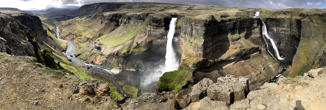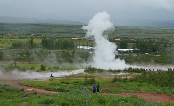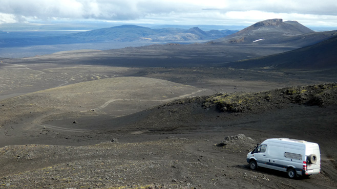 Auf dem Weg zu Islands vielleicht bekanntestem Vulkan, der Hekla, liegt der Wasserfall Thjófafoss, der sich in einen smaragdgrünen See ergießt. Die Hekla trägt über einer Schneekappe fast immer eine Wolkenhaube, auch uns ist ein ungetrübter Blick auf den Berg nicht vergönnt. Aber man kann bis fast ganz hinauf auf das 1.491 Meter hohe Massiv fahren. Zumindest theoretisch. Für uns ist auf etwa 850 Meter Schluss, da ab hier die Piste nicht mehr gewartet wird und tiefe Längsgräben das Fahren fast unmöglich machen. Ein Geländewagen eines Tour Operators kommt 50 bis 100 Meter höher, aber dann ist auch für ihn Endstation. Aber auch wenn wir nicht den Gipfel erreichen, der ohnehin in Wolken liegt, der Blick über unendliche Lavafelder und etliche Krater unter uns ist überwältigend. Auch die Strecke zu zwei weiteren bekannten Wasserfällen, Háifoss und Gullfoss, ist weitgehend nicht asphaltiert und mehr oder weniger rumpelig. Háifoss ist mit 128 Metern der höchste Wasserfall und Gullfoss mit 170 Metern Breite vielleicht der spektakulärste. Am Abend sehen wir uns noch den Geysir an. Nicht irgendeinen, sondern den. Den Urgeysir, der allen anderen den Namen gegeben hat. Er ist leider nur mehr höchst selten aktiv, doch gleich daneben spuckt der Strokkur alle paar Minuten eine Fontäne in die Luft. Wir übernachten ganz in der Nähe auf dem Campingplatz Skjól. Km 251/1.035/2.967/138.614.