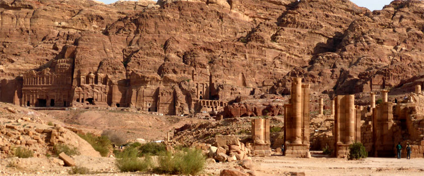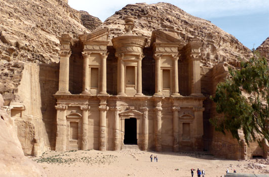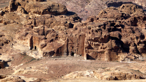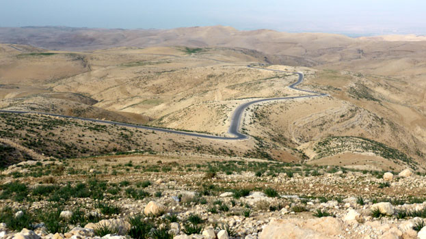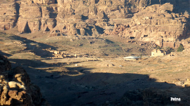 Gleich in aller Früh sind wir am Mount Nebo, auf dem Gott Moses das Gelobte Land gezeigt haben soll. Tatsächlich sehen wir bis hinüber nach Israel, sogar Jerusalem ist erkennbar. Trotz des tollen Ausblicks sind wir etwas enttäuscht, denn die Taufkapelle ist wegen Renovierung geschlossen (die Wiedereröffnung sollte 2009 stattfinden) und das bekannte Tiermosaik mit dem Zebra nicht zugänglich. Über den Desert-Highway fahren wir nun ein Stück nach Süden, bis wir nach Umm er Rasas abbiegen. Die archäologische Stätte ist auf den ersten Blick enttäuschend, praktisch alle Bauten sind gründlich zerfallen. Dennoch (oder gerade deshalb?) hat man unter Trümmern tolle Mosaike gefunden. Ein riesiges und fast unversehrtes Mosaik auf dem Boden einer Basilika aus dem 8. Jahrhundert, das unter anderem Ansichten vieler Städte der Region zeigt, wird von einer großen eisernen Dachkonstruktion vor Verwitterung geschützt. Weitere Mosaike sind ohne jeden Schutz der Verwitterung und vor allem den Touristenschuhen ausgesetzt, so zum Beispiel eine Darstellung zweier Löwen. Auf der King's Road fahren wir nun weiter südwärts, queren das spektakuläre Wadi Mujib, das an den Grand Canyon erinnert, und halten in Kerak, um der dortigen Festung einen Besuch abzustatten. Wegen des Wassers aus dem Stausee ist die Gegend sehr fruchtbar, auf vielen Feldern sprießt eben das erste Grün, allerlei Gemüse wird an der Straße zum Kauf angeboten. Mit dem Wadi Hasa queren wir einen weiteren Canyon und ab Tafila wird die Gegend wieder zur Wüste. Kurz vor der Dämmerung erreichen wir bei Dana einen Aussichtspunkt, der einen tollen Blick ins Wadi Araba, das Tal zwischen Rotem Meer und Toten Meer, bietet. Erst bei Dunkelheit treffen wir in Petra ein, wo wir zunächst in einem winzigen Lokal zu Abend essen und dann unser reserviertes Zimmer in einem Hotel beziehen, das unsere Erwartungen nicht so ganz erfüllt. Susi sagt: Wenigstens ist die Bettwäsche sauber. Km 341/1.271.