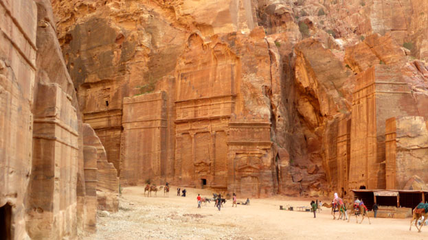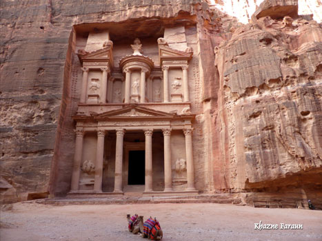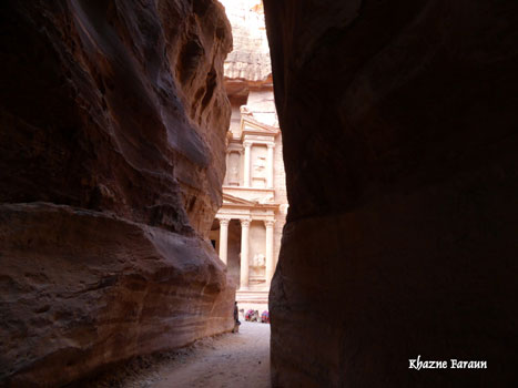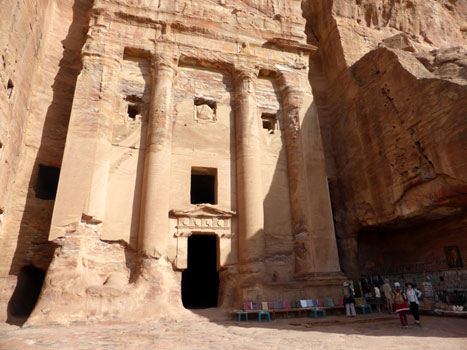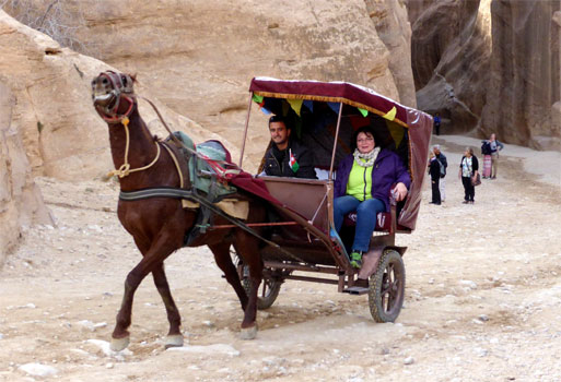 An den bisher besichtigten Sehenswürdigkeiten mussten wir keinen Eintritt bezahlen, oder nur wenige Dinare. Ganz anders in Petra: Hier hat man das Eintrittsgeld vor kurzem von 26 auf 50 Dinar (55 Euro) pro Person angehoben; Touristen, die nicht in Petra übernachten, bezahlen sogar 90 Dinar! Da wir wissen, dass hier große Wegstrecken zurückzulegen sind und Susi ja nicht so toll zu Fuß unterwegs ist, mieten wir eine Kutsche, die uns bis Khazne Faraun bringt. Zunächst geht es ein Wadi abwärts, in dem bald in den Felsen eingehauene Gräber auftauchen, eines mit Obelisken darüber. Nun führt der Weg durch den Siq, eine enge, etwa eineinhalb Kilometer lange und über 70 Meter tiefe Schlucht, teilweise nur wenige Meter breit, stellenweise ist noch das Pflaster aus der Römerzeit zu sehen. Und plötzlich öffnet sich die Schlucht und wir stehen staunend und zu tiefst beeindruckt vor dem in den roten Fels gehauenen Grabtempel Khazne Faraun. Als wir endlich den Blick von der imposanten Fassade abwenden können, gehen wir durch die nun breitere Schlucht, in deren Wände immer wieder Gräber eingehauen sind. Dann öffnet sich das Gelände und wir stehen vor dem ehemaligen Stadtzentrum von Petra. Natürlich gibt es ein Amphitheater, doch dieses ist nicht aus Steinen erbaut, sondern aus dem Felsen herausgehauen. Der Cardo maximus, die Hauptstraße, weist teilweise noch Originalpflaster auf, doch die meisten Bauten, etwa das Nymphaeum und der große Tempel sind schon verfallen. Lediglich der Qasr el Bint, der Palast der Pharaonentochter, ragt noch an die 30 Meter auf. Nun geht es über mehr als 800 Stufen gut 200 Höhenmeter hinauf auf das Felsplateau Ed Deir. Auf Grund der vielen verwackelten Fotos aus der rüttelnden Kutsche gehe ich zu Fuß, für Susi wählen wir einen Esel. Während sie Mühe hat, sich auf dem Tier zu halten, schwitze ich bald wie verrückt, denn ich versuche natürlich mit dem Esel und seinem Treiber Schritt zu halten. Die Eseltreiber sind übrigens Banditen, denn sie bringen einen nicht ganz hinauf auf das Plateau, sondern setzen einen auf einem kurzen ebenen Stück ab und verschwinden sofort. Doch gleich nach einer Biegung kommt nochmals ein steiler Anstieg, wo andere Eseltreiber sich nochmals ein paar Dinare verdienen wollen. Auf dem Plateau beeindruckt uns der Tempel von Ed Deir, der Khazne Faraun auf den ersten Blick sehr ähnlich sieht. Vom gegenüber liegenden Cafe genießen wir den ergreifenden Blick auf den Tempel. Von einem nahen Aussichtspunkt hat man einen Blick auf den Tempel und auf der anderen Seite ins Wadi Araba bis hinüber nach Israel. Zu Mittag essen wir im einzigen Restaurant am Fuße der 800 Stufen sehr gut, aber auch sehr teuer. Für den Weg zur Königswand und dann weiter nach Khazne Faraun mieten wir wieder einen Esel. Die Königswand ist ein weiteres absolutes Highlight im wahrsten Sinne des Wortes, denn sie leuchtet in der Nachmittagssonne. Hier sind auf mehreren hundert Metern Breite Gräber mit teils zweistöckigen Tempelfassaden in den Felsen gehauen. Wir bleiben dann noch eine Weile vor der Khazne Karaun sitzen und lassen das Bauwerk noch einmal auf uns wirken, soweit dies jetzt möglich ist, denn nun wimmelt es von Japanern, Italienern und Souvenirverkäufern. Während Susi wieder mit der Kutsche durch den Siq fährt, gehe ich zu Fuß, um doch noch ein paar brauchbare Bilder zu machen. Km 1/1.272.