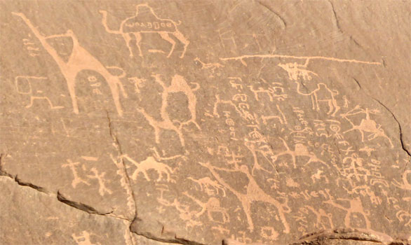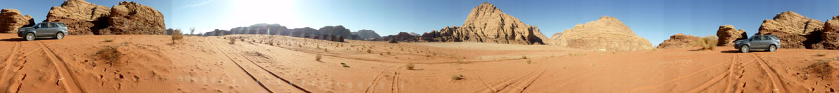 Via Desert-Highway und einem Stück Landstraße kommen wir zum Visitor-Center des Wadi-Rum. Dort will man mit aller Gewalt erreichen, dass wir hier unseren Wagen stehen lassen und uns auf einem Pickup mit Fahrer und Führer herumchauffieren lassen. Als ich sowohl das als auch die Mitnahme eines Führers in unserem Wagen ablehne, lässt man uns wissen, dass wir ohne Führer das Camp nicht finden werden, da die Koordinaten nicht stimmen. Wir lassen es drauf ankommen und fahren alleine. Über das Wadi Rum kann man nicht viel sagen, man muss es einfach erleben. Es ist eine faszinierende Wüstenlandschaft, eine Sandebene, aus der bizarre Felsen bzw. Berge ragen. Manche dieser Felsen sind einander so nahe, dass nur ein schmaler Spalt bleibt. An mehreren Stellen gibt es Felsgravuren zu sehen, die Tiere darstellen. Wir legen unsere Route so, dass wir schon zu Mittag und nicht erst am Abend unser Camp erreichen und siehe da: An den in der Buchungsbestätigung angegebenen Koordinaten ist rein gar nichts. Ein Camp ist weit und breit nicht zu sehen. Obwohl wir mehrere Einheimische nach dem Camp fragen, erhalten wir keine brauchbare Antwort. Da uns diese Masche "falsche Koordinaten angeben, damit man einen Führer buchen muss, um ins Camp zu finden" gar nicht gefällt, beschließen wir kurzerhand, am Abend nach Aqaba zurückzufahren und dort zu übernachten. Zuvor genießen wir aber noch die Fahrt durchs Wadi und sitzen auch noch ein ordentliche Weile in der Sonne. Km 232/1.713.