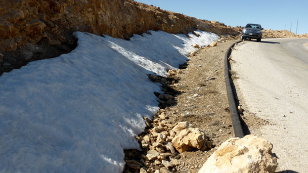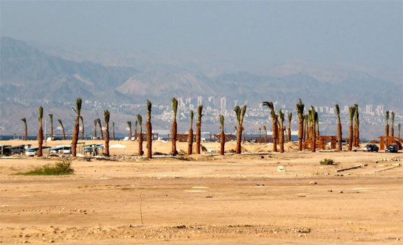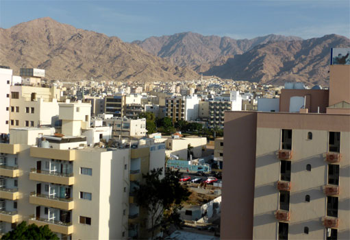 Nun geht es wieder auf der King's Road weiter südwärts, wobei sich auf den ersten 20 Kilometern nach Petra tolle Ausblicke auf beeindruckende Felslandschaften auftun. Kurz nach ar-Rajif verlassen wir die King's Road, stoßen gleich darauf auf Schneereste (!) neben der Straße und queren in al-Muraygha den Desert-Highway, um in das Dorf Ras an-Naqab zu gelangen. Das Dorf liegt am Rand eines Geländeabbruches, von dem man einen atemberaubenden Blick in die Tiefebenen nach Westen und nach Süden bis ins Wadi Rum hat. Aus der Ebene ragen kulissenartig verschachtelt rotbraune Felskegel auf. Einfach phantastisch! Nun geht es auf dem Desert Highway rasch voran. In al-Quwayra essen wir zu Mittag Falafel mit Gemüse und Sauce in der Fladenbrottasche. Beim Bezahlen staune ich nicht schlecht, als der Wirt für zwei Portionen einen Dinar (1,10 EUR) will, dann aber noch einige Münzen rausgibt, die ich sofort als Trinkgeld zurückweise. Kurz vor Aqaba verlassen wir den Highway und fahren Richtung saudi-arabischer Grenze. Die Straße senkt sich und das Rote Meer liegt vor uns; wir sehen bis nach Ägypten hinüber. Wenige Kilometer vor der Grenze treffen wir auf die Küstenstraße, auf der wir nach Aqaba fahren. Auf den wenigen öffentlichen Stränden spielt sich bereits das Weekend-Life der Jordanier ab, die hier in Scharen mit Blick auf Elat in Israel picknicken und sich teilweise schon zur Übernachtung einrichten. Das Meer ist kühl, aber ein Bad wäre sicher möglich, wäre da nicht der ungemütliche kalte Wind. In Aqaba beziehen wir Quartier im Days Inn und genießen den Blick über die Stadt vom Pool auf dem Dach. Zum Abendessen im Captain's Restaurant gibt's Fisch, aber was für einen: Gut 30 Zentimeter lang, sicher mehr als ein halbes Kilo schwer und sowas von lecker! Damit wir morgen im Wadi Rum nicht Zeit mit dem Suchen einer Unterkunft verplempern müssen, buchen wir schon heute Abend bei booking.com: Übernachtung im 2-Bett-Zelt mit Frühstück und Gemeinschaftsbad, Bergblick, gratis Parkplatz (unglaublich!) und - man staune - gratis WLAN. Wir trinken auch noch eine Dose von dem 16%-igem Bier. Praktisch, da kriegen zwei Leute eine Knalle davon! Km 209/1.481.