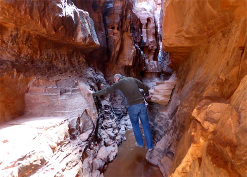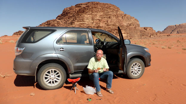 In der Früh kaufen wir noch für das geplante Wüsten-Mittags-Picknick ein, dann fahren wir durch den "Hintereingang" wieder ins Wadi Rum. Dabei handelt es sich um eine inoffzielle Zufahrt von Südwesten durch freies Gelände, die von Aqaba aus wesentlich kürzer ist, als die Anfahrt über den Haupteingang im Norden. Ohne Koordinaten und GPS ist die Strecke unmöglich zu finden (wir verfahren uns trotz GPS einemal ganz enorm); außerdem bestünde die Gefahr einer Grenzverletzung, denn Saudi-Arabien ist hier ziemlich nahe. Überraschender Weise erwartet uns am Beginn der Strecke direkt an der Autobahn, von der man einfach abfährt (Zäune oder Leitplanken gibt es ohnehin nicht, jeder fährt auf und ab, wo es für ihn passt), eine Polizeistation mit Schranken und Nagelmatte. Ich halte mit Respektabstand, gehe auf die Polizisten zu und sage, ich hätte gehört, dass man von hier ins Wadi Rum einfahren könnte. Die Polizisten verstehen zwar nicht Englisch, haben aber Wadi Rum verstanden und schon sind wir durch. Wir fahren eine ausgedehnte Runde durch die wunderschöne Landschaft des Wadis, halten an interessanten Punkten und machen zweimal eine längere Rast. Es ist wunderbar warm und total still. Erst nach Einbruch der Dunkelheit kommen wir in unsere Suite im Daysinn zurück. Zu Abend essen wir recht gut in einem nahen In-Lokal unter freiem Himmel . Wir hören aktuelle jordanische Musik und beobachten die Einheimischen. Sehr viele junge Leute rauchen Wasserpfeife, auch Frauen. Zwei Restaurantbedienstete sind ausschließlich mit dem Verleihen, Entleeren und Nachfüllen der Wasserpfeifen beschäftigt. Bald sind wir von dem süßlichen Rauch miteingenebelt und fast auch ein wenig high. Auf den Gehsteigen der Stadt reiten Burschen auf Kamelen herum und rufen "Taxi?". Km 199/1.912.