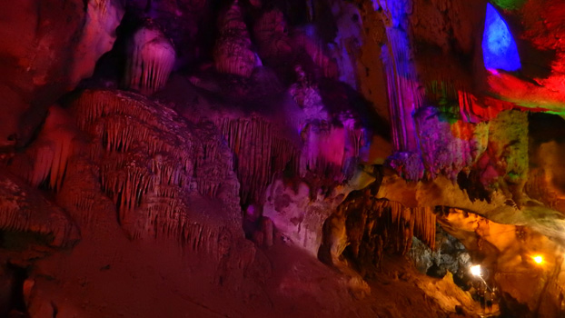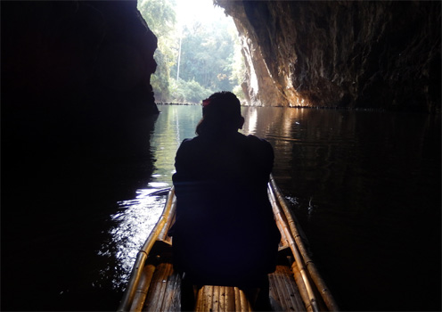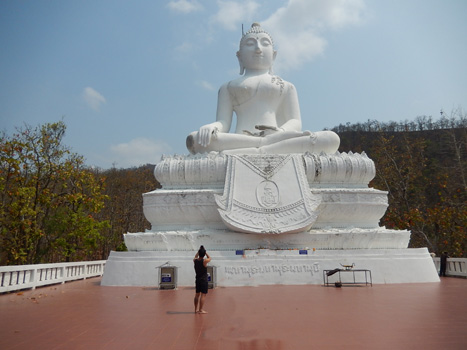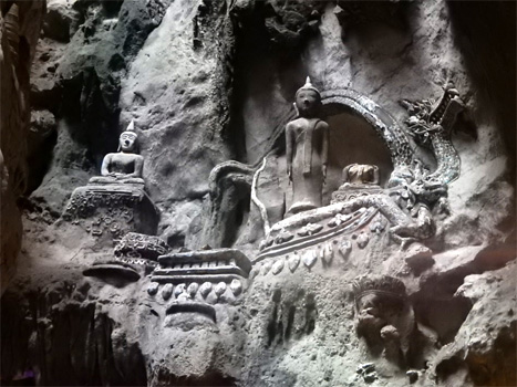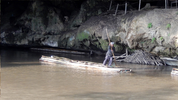 Die Tropfsteinhöhle ist echt sehenswert, nicht nur wegen ihrer Größe, sondern vor allem, weil sie von einem Fluss durchflossen wird und man zu manchen Abschnitten nur per Floß gelangt. Um sie zu besichtigen, muss man eine Führerin mit Petroleumlampe und einen Flößer engagieren (550 Baht = 14 Euro für 1-3 P.). Auf einem schmalen Bambusfloß, auf dem man mehr im als über dem Wasser sitzt, fahren wir in die Tham Lot ein. Da andere erst auf dem Weg hierher, wir aber schon da sind, haben wir die Höhle ganz für uns allein. An manchen Stellen hängen zahlreiche Fledermäuse von der Decke. Zwischendurch auf Holzstegen zu Fuß, dann wieder mit dem Floß, erkunden wir mehrere riesige "Räume" mit interessanten Tropfsteinformationen, darunter auch die "Sarghöhle", in der mehrere prähistorische Särge gefunden worden sein sollen, wobei die Särge, die wir zu sehen bekommen, so es denn überhaupt welche sind, keinesfalls prähistorisch anmuten. Am Ende der Höhle, dort wo der Fluss wieder ins Freie gelangt, sehen wir tausende, unser Reiseführer spricht von hunderttausenden, Mauersegler aus der Höhle fliegen. Hier wenden wir zur Rückfahrt flussaufwärts, zu der nun zusätzlich zu den Kräften des Flößers jene der Führerin von Nöten sind. Wir fahren nun weiter nach Pai, einem reizenden Ort, der, so scheint es, fast ausschließlich aus Lokalen und Gästehäusern besteht. Entsprechend viele Touristen, überwiegend junge Leute, Asiaten wie Europäer, tummeln sich in den Straßen und sitzen in den Restaurants und Bars. Wir fahren zunächst zu dem auf einem im Osten des Ortes auf einem Hügel gelegenen Wat Phra That Mae Yen, über dem ein neu errichteter weißer Buddha thront. Die Verkaufsstände vor dem Tempel bieten fertige Opfersets als Gabe für die Mönche an, etwa Fruchtsaft, Kekse, Chips, Zahnpasta, Seife, Klopapier, alles in einem Plastikkübel und in Folie eingeschweißt. Auf der Weiterfahrt nach einem leckeren Mittagessen in einem der vielen Lokale im Ort sehen wir am Flussufer ein Wohnmobil in LKW-Größe stehen. Ein Blick durch das Fernglas zeigt ein Züricher Kennzeichen und bald unterhalten wir uns mit den Schweizern bei einem Kaffee. Die beiden sind ebenfalls seit April 2014 unterwegs, allerdings ohne andauernd nach Hause zu fliegen. Nach einem regen Austausch von Reiseinformationen fahren wir noch gut zwei Stunden, bis uns ein Wegweiser zum Pong Duet Geysir die kurvige Fernstraße verlassen lässt. Es geht ein paar Kilometer durch den Urwald; wir übernachten ganz alleine auf dem Parkplatz. Kaum angekommen, beginnt es heftig zu regnen und bald ist ein Gewitter im Gang. Die Regenzeit sollte doch erst im Mai kommen! Wer leugnet noch den Klimawandel? Km 118/533/44.935.