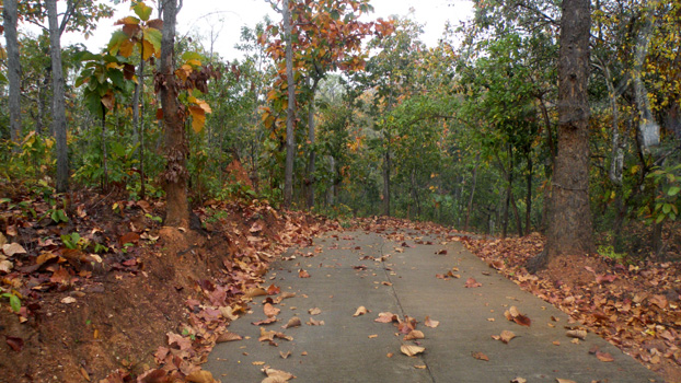 Wir schlafen uns ordentlich aus (die vorige Nacht war ja wegen der sechsstündigen Zeitumstellung recht kurz) und pennen bis neun. Beim Frühstück diskutieren wir die Route bis Mae Hong Song und entscheiden uns gegen die Fernstraße über Hot und Mae Sariang. Wir fahren die langsamere, aber vermutlich landschaftlich schönere Strecke, die zunächst noch einmal durch den Doi Inthanon Nationalpark (630 Baht =17,5 EUR) führt. Den Abstecher zum Inthanon-Gipfel lassen wir diesmal aus. Mit funktionierendem Turbo ist die Fahrt auf der Bergstraße eine Freude; wir erinnern uns, wie das im November mit kaputtem Turbo mühsam war: Manche Steigung war nur im Schritttempo zu bewältigen. Später geht es weiter kurvig berauf- und ab durch herbstlich anmutende Berglandschaften auf 900 bis 1.500 Metern. Die Blätter, die verfärbt am Boden liegen, sind riesig. In einem Dorf nehmen wir ein verspätetes Mittagessen ein (30 Baht = 0,83 EUR p.P.!) Auf der Weiterfahrt sind über einen längeren Abschnitt die Berghänge abgeholzt und abgeerntet, offensichtlich war hier Mais angebaut. In Khun Yuam erreichen wir die Fernstraße von Mae Sariang nach Mae Hong Song. Erst kurz nach Sonnenuntergang finden wir einen Nachtplatz, der ist aber 1A: ein Parkplatz auf einem Hügel neben einem total schrägen Denkmal, uneinsehbar, ruhig und keine Menschenseele weit und breit. Das sind ideale Voraussetzungen, um unseren neuen Mini-Griller erstmals in Betrieb zu nehmen. Wir lassen uns Grillwürste mit getoastetem Brot und Mais schmecken. Km 280/300/44.702.