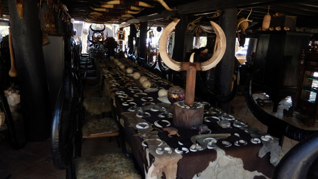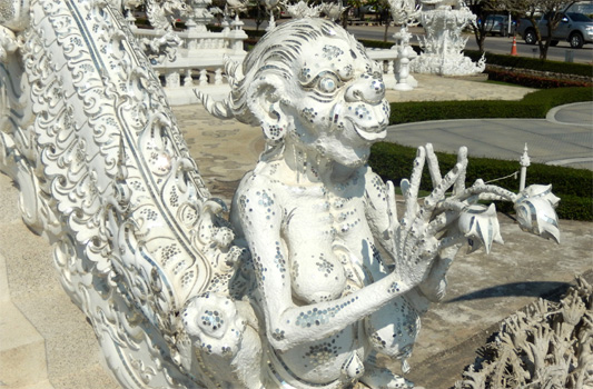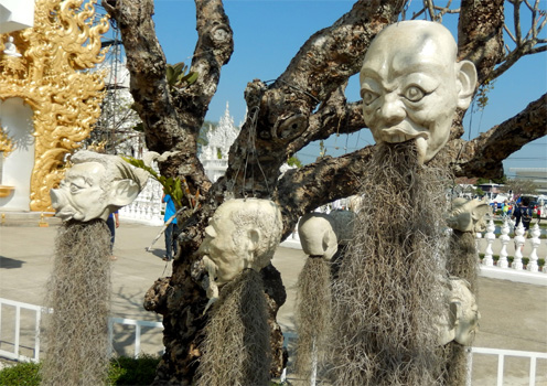 Die Nacht war kalt und ich erwache mit Halsschmerzen. Habe ich mich verkühlt? Chiang Rais außergewöhnlichste Sehenswürdigkeiten, der Weiße und der Schwarze Tempel, befinden sich südlich und nördlich, jeweils einige Kilometer außerhalb der Stadt. Von Süden kommend, sehen wir uns zuerst den Weißen Tempel, Wat Rong Khun (Eintritt gratis) an, eigentlich eine Anlage von etwa einem Dutzend weißer Tempel. 1997 wurde mit dem Bau des Hauptgebäudes begonnen, einige Bauten sind noch unvollendet. Diese Bauwerke zu beschreiben, ist nicht leicht, denn so etwas Schräges haben wir noch nie gesehen. Aus einiger Entfernung sehen die Gebäude wie aus Porzellan gefertigt aus. Dieser Eindruck entsteht dadurch, dass in die weißen Fassaden viele tausende kleinste Spiegel eingelassen sind. Alles weiß, bis auf ein Gebäude, das golden glänzt: die Toiletten. Die Tempel sind verschnörkelt und mit klassischen Motiven, wie Drachen und Kriegern verziert. Daneben gibt es aber völlig irreale Elemente, wie eine Science-Fiction-Figur auf einer Bank, unzählige aus dem Boden ragende Hände und von Bäumen hängende Köpfe. Das Innere des Hauptgebäudes ist mit buddhistischen Motiven zum Thema Leid und Wiedergeburt mit dominierendem Orange ausgemalt. Daneben finden sich aber auch Superman, Spiderman und Batman, Elvis Presley und Michael Jackson, sowie die brennenden Twin Towers. Wenn wir nun denken, schräger geht's nicht, so haben wir uns getäuscht, denn der Schwarze Tempel Baan Dum nördlich der Stadt (Eintritt ebenfalls gratis) steht dem Weißen in punkto Skurrilität um nichts nach. In einem Park befinden sich an die zwanzig zumeist dunkle Gebäude, die meisten aus Holz und mit hohen Giebeln wie Tempel aussehend. Einige Gebäude sind weiß und gemauert; auch diese Anlage scheint noch nicht vollendet. In den Gebäuden befinden sich riesige Tische mit Stühlen aus Hörnern und Geweihen. Auf den Tischen liegen Krokodil- und Schlangenhäute, Felle und Tierzähne und alle Gebäude sind gruselig dekoriert. Einfach total schwer zu beschreiben, musst du selber sehen. Auf der Fahrt vom Weißen zum Schwarzen Tempel machen wir eine Stadtrundfahrt - Chiang Rai ist eine durchaus sympathische, aber wenig sehenswerte Stadt - und essen in einem netten Lokal Noodles with Chicken, wobei, wenn man Füße, Federn, Knochen und Röhren wegrechnet, kaum Chicken in der Schale ist. Am späten Nachmittag fahren wir noch ein ordentliches Stück Richtung Südosten. Wegen des mageren Mittagessens haben wir bald Hunger und halten in Chiang Kham an einem Stand, wo Bratwürste auf dem Griller liegen. Wir kaufen drei Stück und bezahlen samt ein wenig Krautsalat mit Ingwer und Chili, unglaubliche 15 Baht (0,40 Euro). Erst beim Essen wird uns klar, dass die Bratwürste mit Reis und nur vereinzelt Speckstücken gefüllt sind. Sie schmecken aber trotzdem hervorragend. Da ich schon ziemlich erschöpft bin - ein Blick in den Hals ließ mich zu Mittag eine Angina diagnostizieren, wollen wir nicht mehr weit fahren. Wir biegen in den Hof des nächst besten Klosters ein und ersuchen um Asyl. Gar kein Problem, wir können gerne hier übernachten. Später am Abend kommt noch die Oberin mit dem Moped angefahren, erkundigt sich nach dem Woher und Wohin und ist besorgt, dass es uns an nichts mangelt. Km 177/947/45.349.