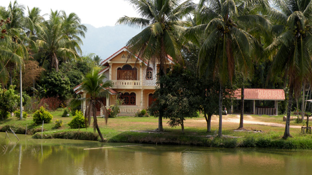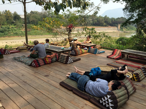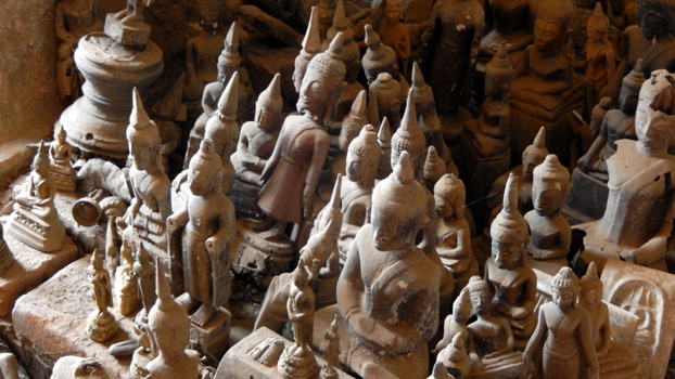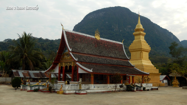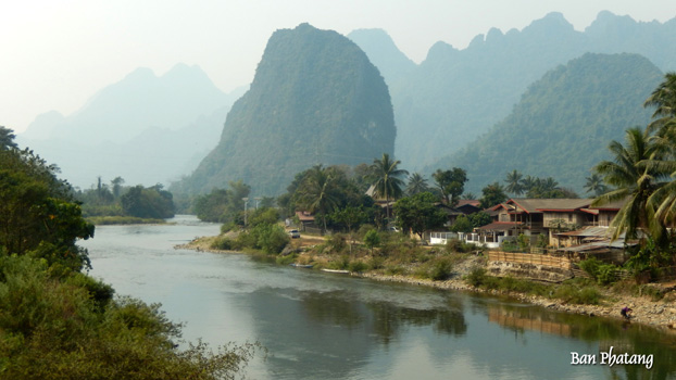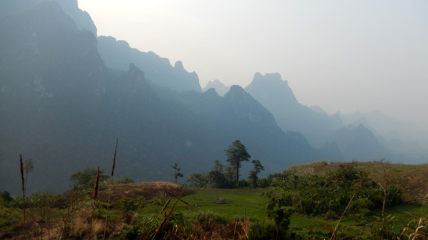 Weiter geht es durch spektakuläres Karstgebirge mit steil aufragenden Felsnadeln. Leider ist die Luft von den vielen Brandrodungen nicht klar. Wir erreichen Van Vieng, das ehemalige Drogen-Eldorado. Die Stadt hat kein Flair, kein Grund sich länger aufzuhalten. Wir sehen uns drei Tempel an und essen im Irish Pub zu Mittag. Guinness gibt es keines, Fassbier auch nicht. Das Lokal, obwohl ziemlich heruntergekommen, ist voll, wahrscheinlich als einziges in der Stadt. Lauter junge Leute sitzen mit Blick auf die Fernseher und sehen sich einen Boxkampf an.