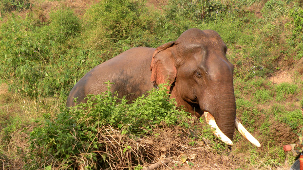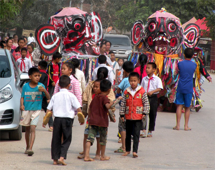 Am Vormittag landen wir in Xayaboury (Sayabouli), einer netten Kleinstadt mit vielen hübschen Häusern, in der es uns gelingt, eine Haftpflichtversicherung abzuschließen (Allianz Generali, N19.27981 E101.70951, 2 Wochen 113.000 Kip = 13 Euro). Wir sehen uns den im Süden der Stadt gelegenen Wat Sibunheuang an, einen alten Tempel mit bunten Bildern an den Wänden, zu dessen Betreten Susi einen Sarong und ein Schultertuch tragen muss. Steht ihr recht gut. Neben dem Tempel befindet sich ein schiefer goldener Stupa. In der Stadt gibt es ein Fest, bei dem Kinder und Jugendliche mit zwei schrecklich aussehenden Gestalten und zu Trommeln tanzend umherziehen. An den Straßen wird gegrillt, aber was da so gut riecht, trifft unseren Geschmack halt so gar nicht: Hühnerklauen, Schweineschwarte mit Fett dran, in Scheiben geschnittener Darm. Dann schon lieber ein Reisgericht mit Gemüse und winzigen Fleischstückchen. Ab Xayaboury ist die Straße in vergleichsweise gutem Zustand, auch einiges breiter, aber sie führt durch ein Dorf nach dem anderen und da heißt es runter vom Gas. Da ich schon den zweiten Tag Fieber habe, braucht es am Nachmittag mal eine Fahrpause, aber es gibt keinen Schatten und nach einer Stunde ist es zum Schwitzen heiß im Auto. Auf einer neuen Brücke überqueren wir den Mekong und umfahren dann Luang Prabang auf einem Bypass, der gar nicht so neu aussieht, den aber weder Landkarte noch Reiseführer kennen. An dieser Umfahrung liegt Ban Noun Savath, wo wir den alten Tempel ansehen, der innen und außen mit buten Bildern bemalt ist, die teilweise recht grausige Szenen aus der Hölle zeigen. In der Nähe liegt das Grab von Henri Mouhot, dem Entdecker von Angkor Wat, der 1861 in Luang Prabang an einer Malaria verschieden ist. Fieber, das Schicksal der Genies. Wir übernachten knapp dreißig Kilometer nördlich von Luang Prabang an einem tollen Platz am Mekong (N20.03697 E102.22412). Leider gibt es kaum Holz, uns so grillen wir heute mit Bambus, doch das ist den Grillwürsten geschmacklich nicht zuträglich. Müssen wir uns merken. Bald ist es stockdunkel und bis auf Frösche und Grillen total still. Km 207/1.398/45.800.