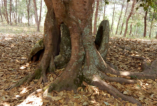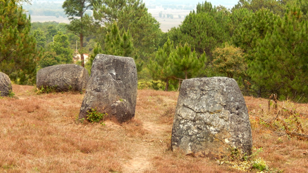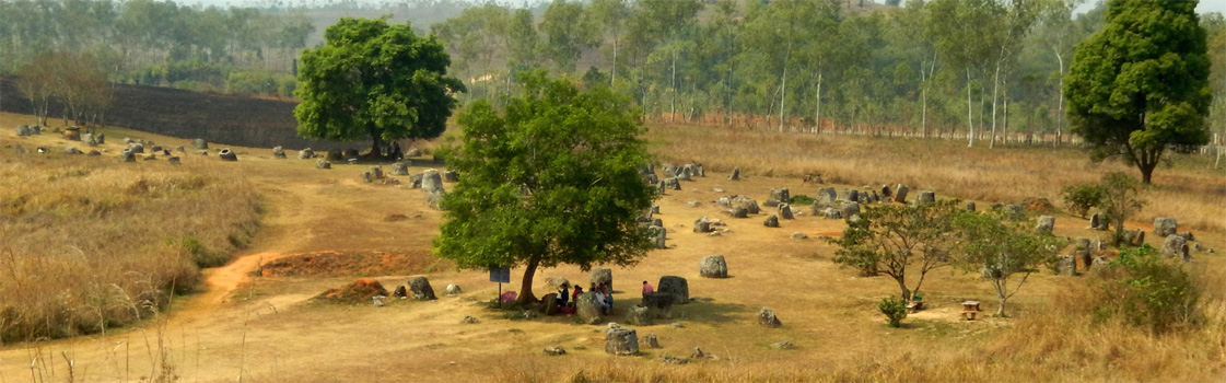 5 Uhr 30: Heftiges Klopfen ans Auto lässt sofort Erinnerungen an den Überfall in Indien wach werden. Vor dem Auto stehen fünf oder sechs Männer mit Gewehren, einer uniformiert. Eine Patroille offensichtlich. Sowas wie Bürgerwehr? Auch die Bewohner des Hauses schauen aus der Tür. Ich schüttle dem Uniformierten, er scheint der Boss zu sein, die Hand und sage allen sabadii. Na immerhin, sie grüßen zurück. So richtig freundlich sind sie nicht, aber direkt zum Fürchten auch nicht. Und natürlich kann keiner Englisch. Ich fang an zu erklären, dass wir zwei Personen sind, Touristen, dass wir hier schlafen und morgen nach Phonsavan weiter fahren. Jetzt wollen sie ins Auto schauen. Ich lass den Boss kurz rein, alle anderen kriegen zu verstehen, dass nur einer rein darf. Man macht sich Notizen in ein Heft, das Kennzeichen wird aufgeschrieben und einer macht telefonisch irgendwo Meldung. Wir dürfen weiterschlafen. Später auf der Weiterfahrt fällt uns auf, dass die Menschen in den Dörfern nicht lachen und nicht zurückwinken. Und es gibt keine Tempel in den Dörfern. Und haben nicht schon gestern am Abend viele Männer Gewehre geschultert gehabt? Die Menschen hier haben vor irgend etwas Angst. In Phonsavan bringen wir in Erfahrung, dass es im Grenzgebiet der Provinzen Luang Prabang und Phonsavan viele Dörfer gibt, in denen Chinesen leben. Zwischen diesen und den Laoten gibt es ethnische Spannungen und es hätte in der Vergangenheit auch etliche Tote gegeben. Südlich von Phonsavan befindet sich die "Ebene der Tonkrüge". Die Anführungszeichen verwende ich, da es sich um keine echte Ebene handelt, sondern um Hügelland, aber im Vergleich zu den Bergen die wir durchfahren haben, ist es halt irgendwie "ebener". Und außerdem handelt es sich nicht um Tonkrüge, sondern es befinden sich auf einem Gebiet von mehreren hundert Quadratkilometern tausende über 2000 Jahre alte bis zu drei Meter hohe Steingefäße. Die sind nicht gleichmäßig verteilt, sondern an manchen Orten stehen gleich hunderte beisammen. Da sich im Vietnamkrieg hier Stellungen der Kommunisten befunden haben, wurde die Gegend von den Amerikanern recht gründlich bombardiert, wovon auch heute noch zahlreiche Bombentrichter zeugen, und wir finden es erstaunlich, dass so viele Steingefäße unversehrt geblieben sind. Wir besuchen drei solcher Orte, Site 1-3, wobei Site 2 besonders schön in einem Föhrenmischwald auf einem kleinen Hügel gelegen ist. Hier gibt es ein Steingefäß, in dem ein Baum gewachsen ist, der das Gefäß zum Bersten gebracht hat. Site 3 ist im Rahmen eines Spazierganges durch Reisfelder zu erreichen und auch hier liegen die Krüge stimmungsvoll unter Bäumen. Um zur Site 1 zu gelangen, wo die meisten Steinkrüge liegen, wird man ein Stück mit dem Elektrowagen gefahren. Die Sites sind noch nicht vollständig von Blindgängern gesäubert und es gibt Markierungen, die den sicheren Bereich anzeigen: Weiß ist gut, rot ist Blut. Wir halten kurz Rat, ob es sich noch ausgehen wird, heute noch die Fernstraße von Luang Prabang nach Vientiane zu erreichen, denn wir wollen nicht noch einmal im Spannungsgebiet übernachten, und beschließen, es zu versuchen. Und es geht sich gut aus. Wir übernachten auf einem riesigen betonierten Parkplatz eines Restaurants mit spektakulärem Gebirgspanorama (N19.38935 E102.42619). Da das Restaurant abends geschlossen ist, wahrscheinlich halten hier tagsüber Busse und daher der große Parkplatz, sind wir fast alleine, nur ein paar Angestellte lungern herum, sind aber nicht näher an uns interessiert. Km 295/1.985/46.387.