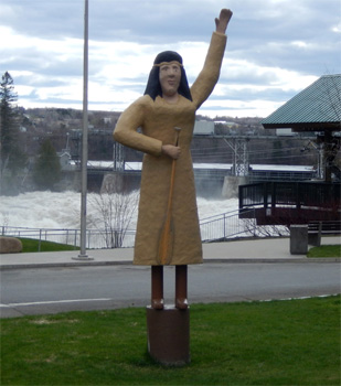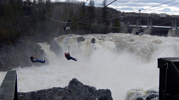 Nach kurzer Fahrt zeigt der Kilometerzähler an, dass der Zerberus genau 300.000 Kilometer auf dem Buckel hat. Mögen uns noch viele, viele weitere Kilometer mit ihm vergönnt sein! Wir finden eine Abkürzung zum Fundy Trail Parkway, doch beim Parkeingang ist Ende. Dieser Park ist mit Schranken und Vorhängeschloss closed for the saison. In Saint John bummeln wir kurz durch die Stadt und sehen uns dann die Reversing Falls an, das sind Stromschnellen, oder, wenn man will, kleine Wasserfälle an der Mündung des Saint John Rivers in die Bay of Fundy, an denen das Wasser bei Ebbe Richtung Meer fließt, bei Flut aber in die Gegenrichtung. Nun geht es flott nordwärts, vorbei an Fredericton und dann entlang der Grenze zum US-Bundesstaat Maine. In Woodstock (nein, es ist nicht das Woodstock) scheint der Zeitpunkt für die schon überfällige Dusche gekommen zu sein, denn es hat 15 Grad, die Sonne scheint und wir sind schon längere Zeit gefahren, sodass das Wasser im Tank halbwegs warm sein könnte (unser Warmwasser wir ja durch den Auspuff erzeugt). Das Unternehmen ist jedenfalls seeehr erfrischend! Zufällig sehe ich, dass die Verkleidung eines Stoßdämpfers abgerissen ist. Da hier Baumärkte auch am Sonntag geöffnet haben, ist das schnell mit einem Gewebeband repariert. In Grand Falls sehen wir uns die Wasserfälle an, die nicht so sehr wegen ihrer Höhe, wohl aber wegen der hinab stürzenden Wassermenge beachtlich sind. Vorbei an Edmundston ist rasch die Grenze zu Québec erreicht.