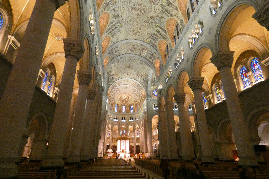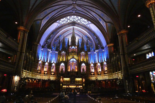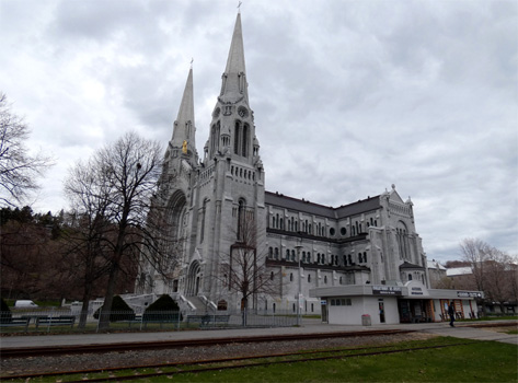 Auf einer riesigen Hängebrücke queren wir den Sankt-Lorenz-Strom. Wir sind auf den ärgsten Montagmorgenverkehr eingestellt, doch es gibt keine Staus und wir kommen rasch ins Zentrum von Québec. Parkplätze gibt es reichlich und teuer. Wir sehen uns das Parlament an und gehen durch ein Tor in die Alte Oberstadt. Diese beherbergt zahlreiche imposante Gebäude aus grauem Stein und ist von einer Stadtmauer umgeben, die zur Gänze restauriert und mit der Zitadelle verbunden ist. Am Rande der Altstadt thront hoch über dem Strom wie ein Schloss das Hotel Le Chateau Frontenac, mit Abstand der eindruckvollste Bau in Québec. Vor dem riesigen Hotel befindet sich eine 400 Meter lange Holzterrasse, die zum Flanieren einlüde, wäre da nicht der kalte Wind. Mit einer Standseilbahn fahren wir in die Alte Unterstadt, wo sich in engen Gassen Souvenirläden und Lokale aneinanderreihen. Nach der sehr anstrengenden Stadtbesichtigung fahren wir in den etwa 30 Kilometer östlich gelegenen Wallfahrtsort Sainte Anne de Beaupré, wo wir die Basilika besichtigen. Die Kirche wurde erst in den Zwanzigerjahren in etwas atypisch (es gibt keine Spitzbögen) neogotischem Stil erbaut. Die Kirche beeindruckt schon von Weitem mit ihrer unerwarteten Größe. Innen kommt sie uns dann noch größer vor und sie besticht durch den mehrgeschoßigen Aufbau, die helle Beleuchtung und die vielen Mosaike. Unter der Basilika befinden sich eine weitere große Kirche und mehrere Kapellen. Km 270/2.607/101.163.