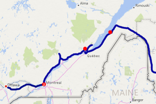 Während in New Brunswick Hinweistafeln und Verkehrsschilder zweisprachig ausgeführt waren, ist jetzt alles nur mehr französisch. Auf dem Highway sind jetzt statt bisher 110 nur mehr 100 erlaubt, wenn er zweispurig ist, ansonsten 90. Der Trans Canada Highway führt über die Appalachen und stößt nun auf den Sankt-Lorenz-Strom, der hier 20 Kilometer breit ist! Wir übernachten in einem entzückenden französischen Dorf am Strom. Km 670/2.367/100.893.
