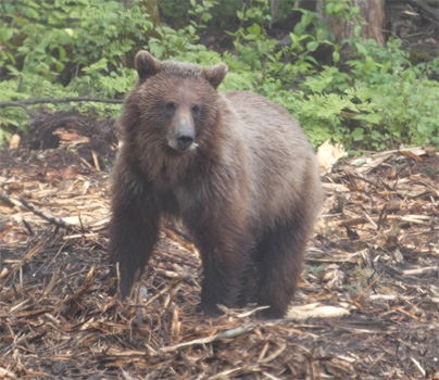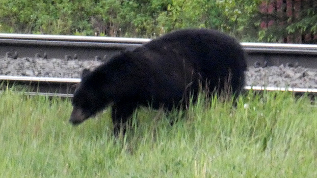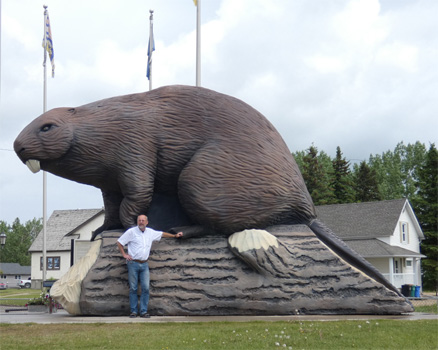 Weiter geht es durch endlose Nadelwälder und immer wieder vorbei an Ölbohrstellen. Häufig bringen von diesen in den Highway einbiegende LKW reichlich Erde auf die Fahrbahn. Da es immer wieder mal regnet, überziehen vor uns fahrende und entgegenkommende Fahrzeuge den Zerberus mit einer dicken Dreckschicht. Vielleicht weil wir dadurch gut getarnt sind, nehmen zwei über die Straße trottende Grizzlybären keine Notiz von uns, legen sich sogar am Straßenrand nieder. In Grande Prairie ist die Tiefebene nordöstlich der Rocky Mountains erreicht. Der kleine Ort Beaverlodge ringt mit einer großen Biberstatue um Aufmerksamkeit.