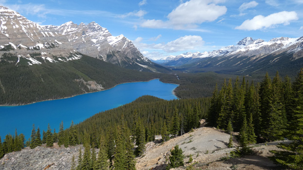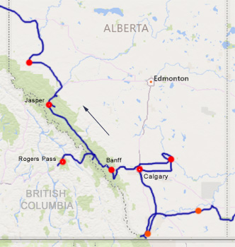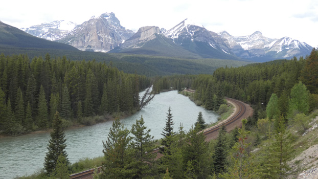In Banff sehen wir uns zunächst die Hoodoos an, vom Aussichtspunkt hat man einen schönen Blick über das Bow Valley. In der Ferne erhebt sich wie ein Schloss das Fairmont-Hotel aus dem breiten Tal. Den Ort selbst finden wir sehr sympathisch, vielleicht, weil in aller Frühe noch kaum Leute unterwegs sind. In der Hochsaison soll es hier ja nur so wimmeln von Touristen. Wir fahren die Vermilion Lakes entlang und dann geht es schon weiter nach Lake Louise. Hier werden Besucher schon einige Kilometer außerhalb auf einen Parkplatz geleitet, wo schon viele hundert Autos stehen, sogar die Anzahl der Wohnmobile ist garantiert dreistellig. Ein Shuttlebus bringt die Leute zum Lake Louise und weiter zum Moraine Lake. Beide Seen sind ein Wahnsinn! Türkisblaues Wasser, dahinter die Dreitausender, teils von Gletschern bedeckt, in Reih und Glied. Und erstaunlicherweise ist es an den Seen gar nicht einmal so überlaufen, wie man erwartet hätte. Wir setzen uns noch auf ein Getränk in den zu einem stimmungsvollen Restaurant umgebauten Bahnhof von Lake Louise. Neben dem Lokal stehen noch drei Speisewagen der Canadian Pacific Railway, in denen man auch speisen kann. Wir machen nun einen Abstecher zum Rogers Pass in British Columbia, da die Strecke dorthin eine der schönsten Bergstraßen der Welt sein soll. Der Autor unseres Reiseführers muss wohl ein Flachländler sein. Wir Älpler finden die Route zwar durchaus reizvoll, doch da kann schnell einmal ein Alpenpass mithalten. Jenseits des Rogers Passes sehen wir uns den Hemlock Grove Rainforest an und treten dann die Rückfahrt an. Wir übernachten nahe der Passhöhe auf 1.300 Metern. Zwischen Banff und Lake Louise haben wir heute drei Viertel der Erde umrundet! Km 315/10.331/108.887.