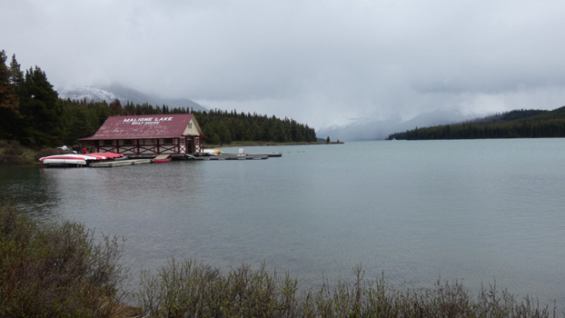 Wir haben Glück: Als der erste Zug vorbeirattert, ist es ohnehin Zeit zum Aufstehen. Bagger und LKW sind schon weg, die haben wir gar nicht gehört. Dafür schaut der Bär wieder vorbei. Das Wetter ist mies, dunkle Wolken hängen tief und immer wieder nieselt es. Es hat den ganzen Tag nur drei bis sieben Grad. Wir sehen uns die in der Nähe von Jasper gelegenen Patricia und Pyramid Lakes an, in ersterem befindet sich das Wrack eines Flugzeugträgers, was für einen kleinen See, tausende Kilometer vom Meer entfernt, doch irgendwie ungewöhnlich ist. Wer es nicht so recht glauben will, dass die Briten im zweiten Weltkrieg allen Ernstes einen Flugzeugträger aus Sägespänen und Eis bauen wollten, sollte einmal "Project Habbakuk" googeln. Durch viel toten Wald geht es vom Maligne Canyon, der von mehreren Brücken überspannt wird, zum Medicine Lake und weiter zum Maligne Lake. Die beiden je etwa 20 Kilometer langen Seen sollten vor der Kulisse schneebedeckter Berge türkis erstrahlen. Dass sich das nicht ausgeht, wenn von den Bergen kaum was zu sehen ist, versteht sich von selbst. Kurz vor dem Parkausgang befinden sich die Miette Hot Springs, wo wir ein Bad nehmen. Die Gegend ist vom Neuschnee von heute Nacht angezuckert, die Becken befinden sich im Freien und das Thermalwasser hat 38 bzw. 40 Grad. Herrlich! Die Bademeister tragen dicke Jacken, Hauben und Fäustlinge. Daneben gibt es noch zwei kleinere Becken mit 10 und 16 Grad, in denen man es echt nur kurz aushält. Kurz nach der Ausfahrt aus dem Nationalpark biegen wir in die Route 40 ein. Auf dem Wegweiser ist zu lesen: Scenic Route to Alaska. Das ist bemerkenswert, denn bis Alaska sind es noch 3.000 Kilometer. Das wird also ein paar Tage in Anspruch nehmen, wir sind ja im Urlaub und nicht auf der Flucht. Wir übernachten in dem Bergdorf Grande Cache neben einer insolventen Autowaschanlage. Km 418/11.246/109.802. Sonnenuntergang 22.23, Sonnenaufgang 5.26